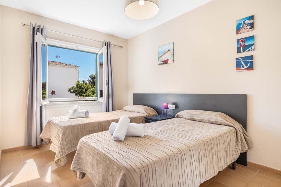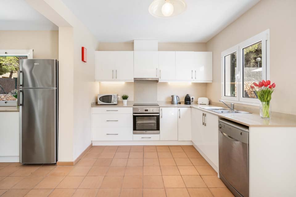 Inde i opholdsrummet er en moderne skønhed med en overdådig sofa, lysegrønt, friske hvide vægge og moderne indretning. Rundt om hjørnet ligger et lækkert hvidt køkken, veludstyret med de nyeste hårde hvidevarer og blanke bordplader. Med et stort sæt skydedøre, der åbner ud til terrassen og altanen, er rummet oversvømmet med naturligt lys, der oplyser rummet med et varmt skær. På tværs af villaen er et dobbeltværelse og to dobbelte soveværelser, et hyggeligt afslapning efter en travl dag på stranden. Beliggende i hjertet af Cala Galdana, kan denne hesteskoformede bugt prale af blødt hvidt sand og lavt, turkisblåt vand, der er perfekt til svømning. Med et livligt centrum fyldt med lokale restauranter, barer og caféer kan du bruge hele dagen på at udforske denne menorcanske perle.