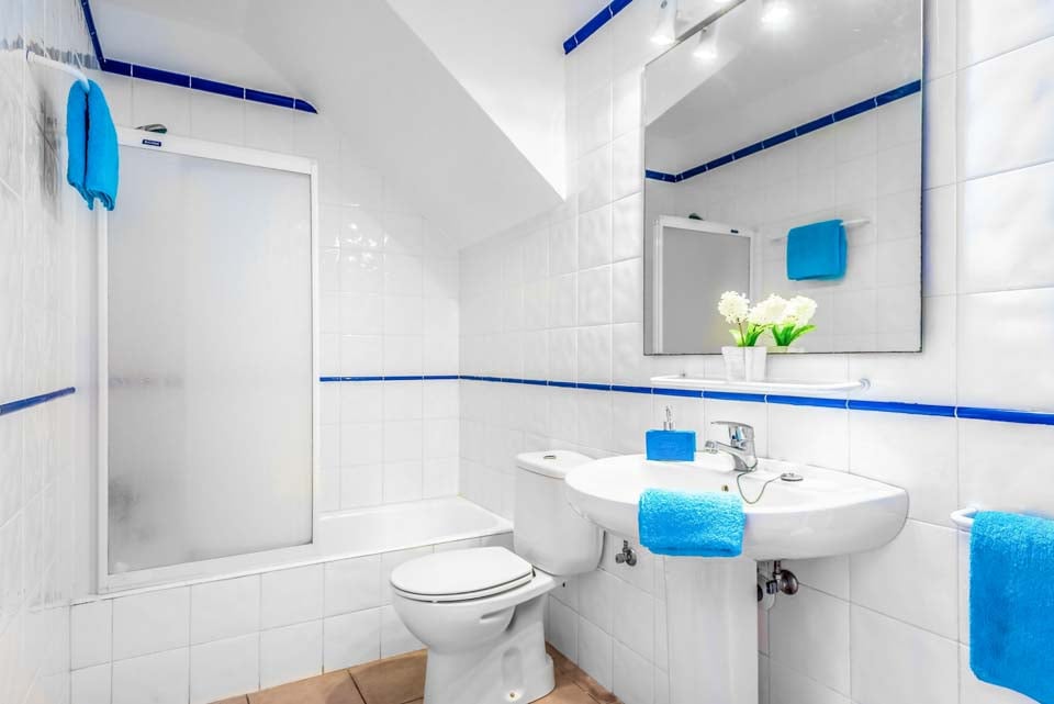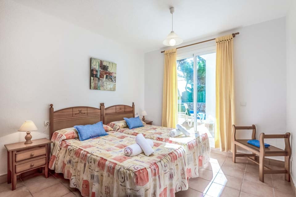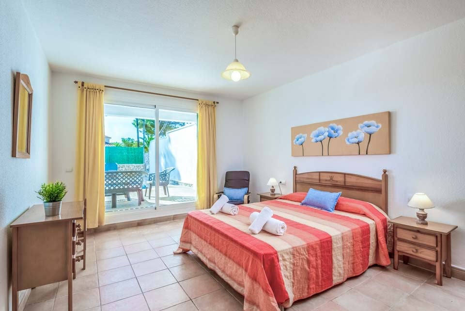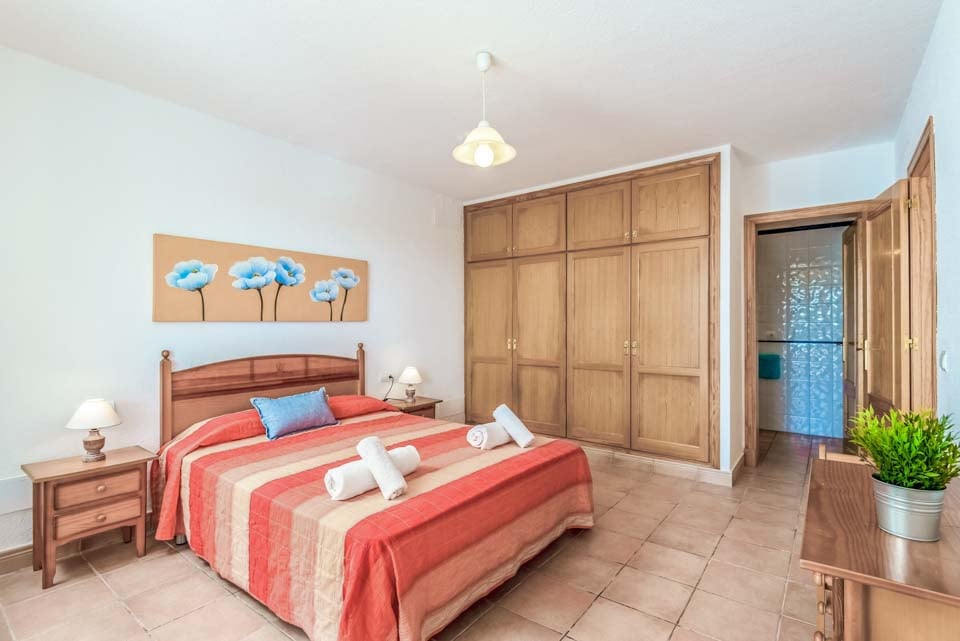 Villaen har tre smagfuldt indrettede soveværelser i stueetagen, hvilket giver rigelig indkvartering for gæsterne. To af disse soveværelser har ensuite badeværelser, hvilket sikrer privatliv og komfort. Med direkte adgang til poolterrassen tilbyder disse værelser med eget bad en problemfri indendørs-udendørs opholdsoplevelse, så gæsterne kan nyde middelhavsbrisen. Det tredje soveværelse har et tilstødende brusebadeværelse, der sikrer ekstra bekvemmelighed for alle beboere.