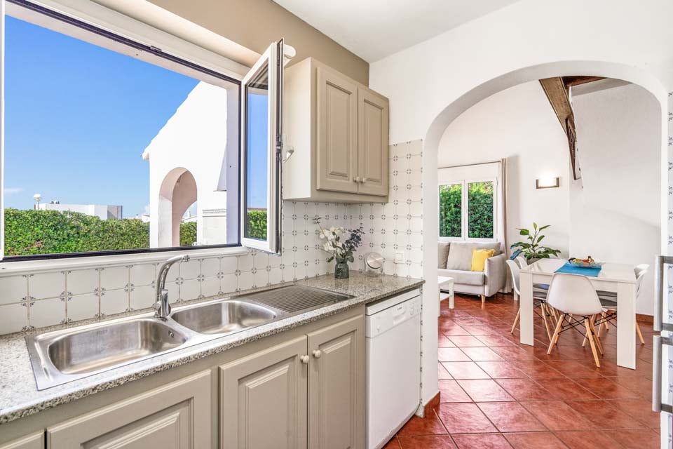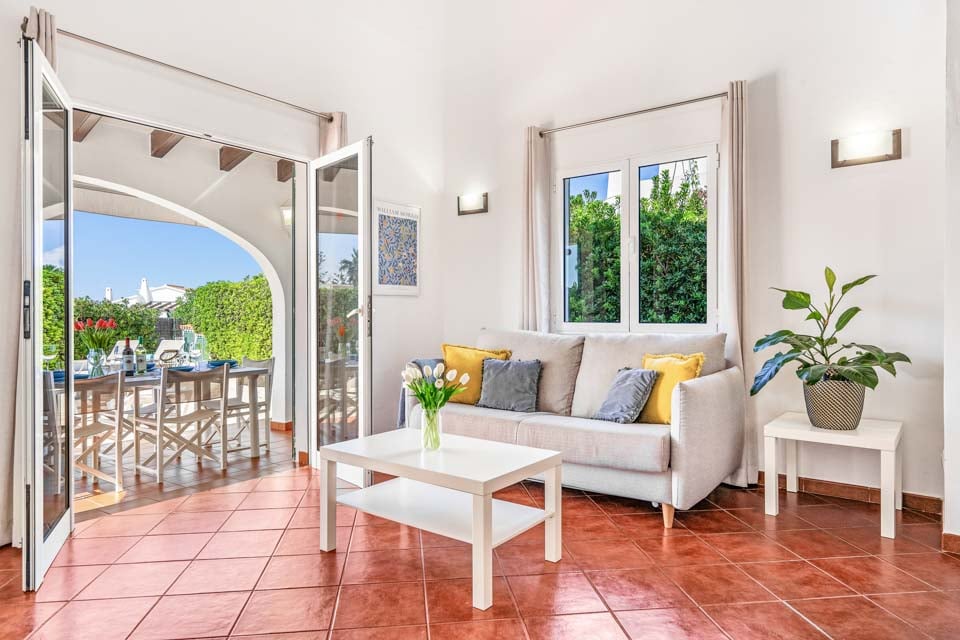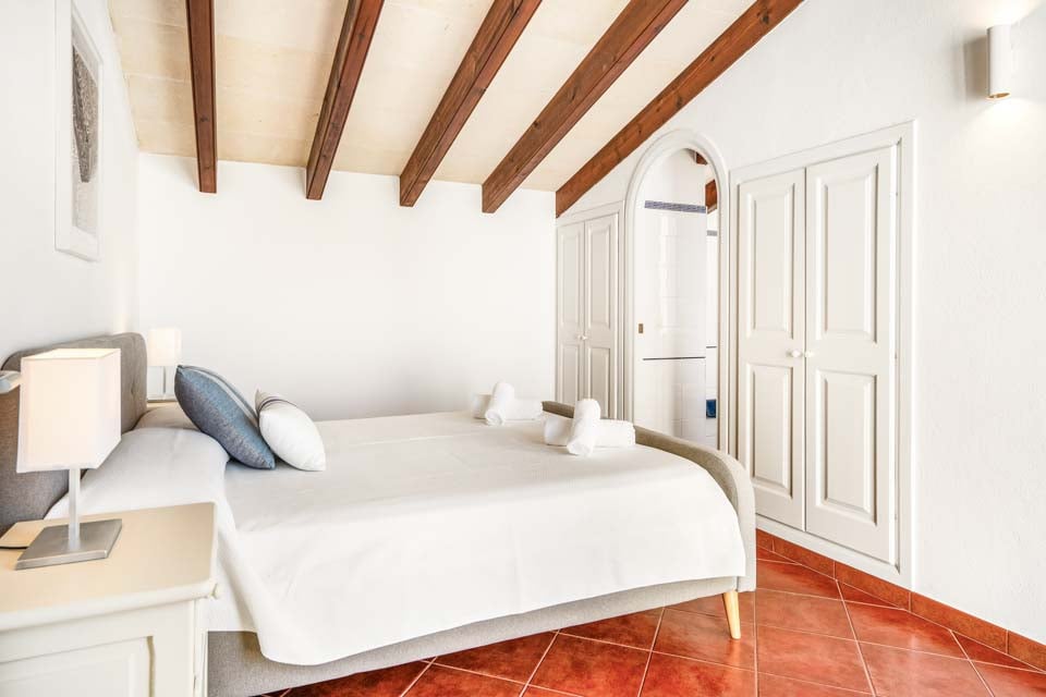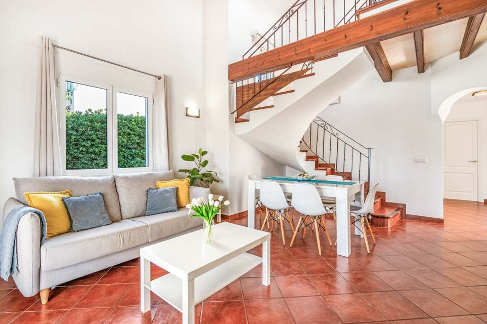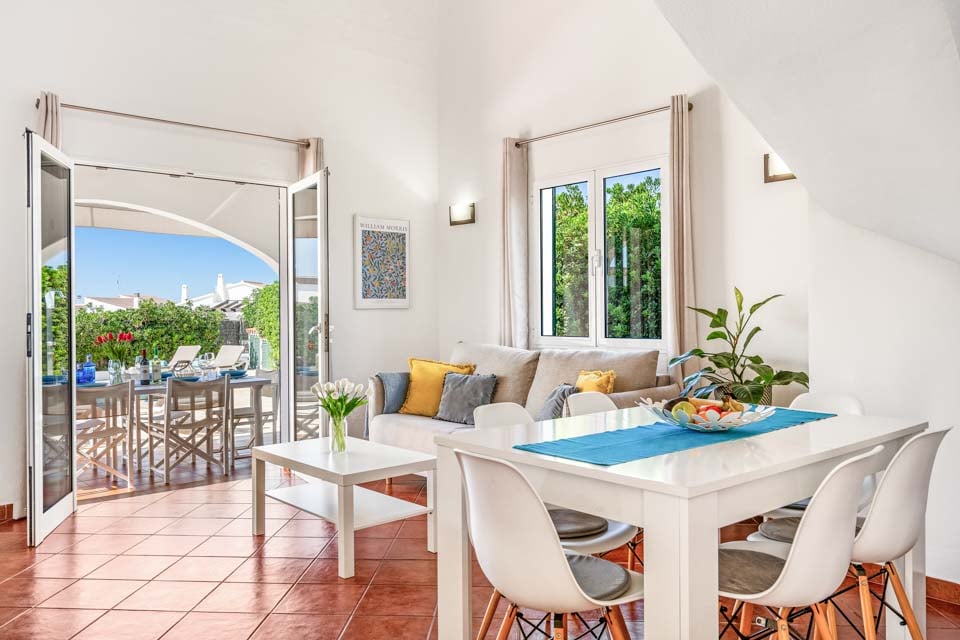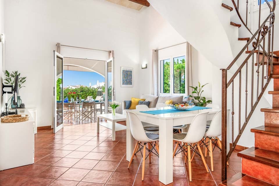 Villa Janis er en menorcansk perle, bygget med stuk hvide vægge, terracotta tagsten og buede buer. Interiøret er en smuk kontrast til den traditionelle menorcanske stil, med lyse træmøbler, friske hvide vægge og moderne indretning overalt. Opholdsrummet i åbent plan er lyst og rummeligt med tilknyttet et hyggeligt køkken i landlig stil, som er fuldt udstyret med alt hvad du behøver til at lave mad. Den smukke vindeltrappe fører dig til det store soveværelse med dobbeltseng ovenpå, mens to dobbeltværelser er i stueetagen.