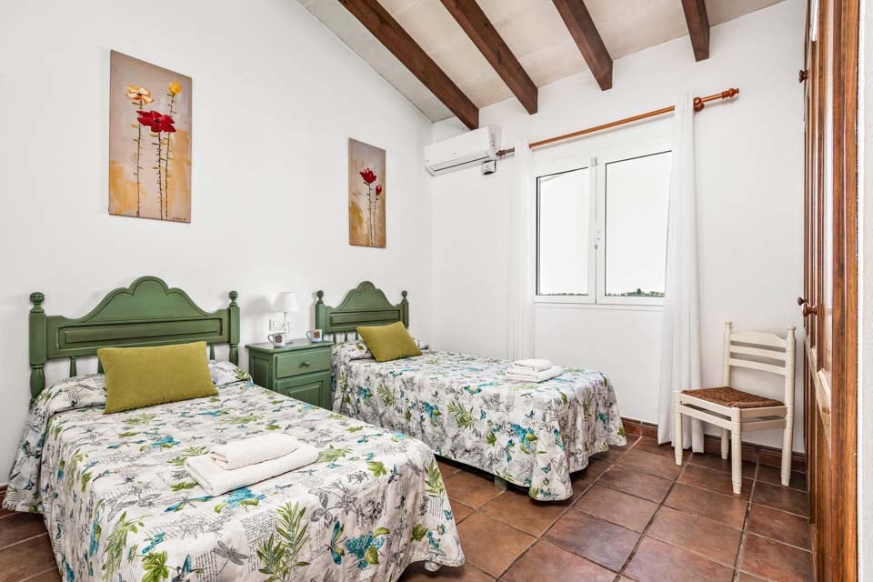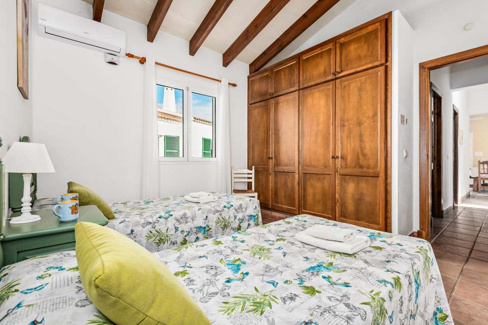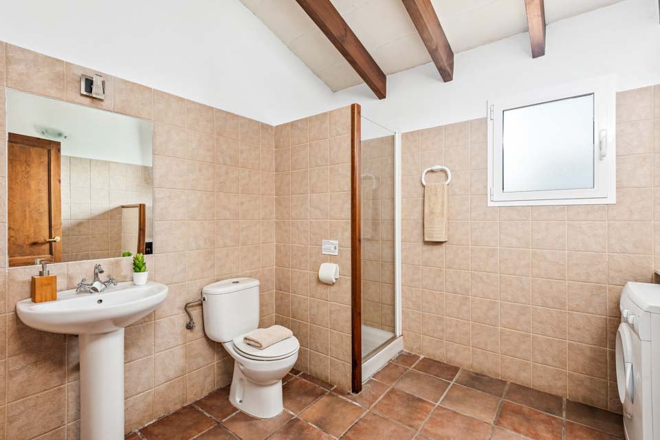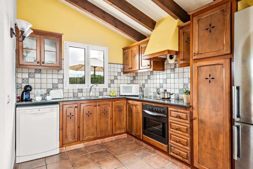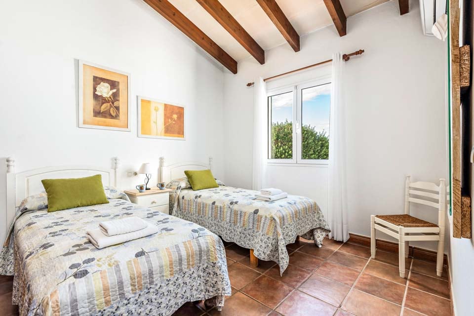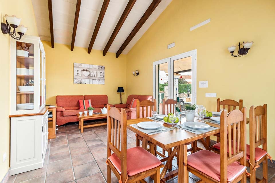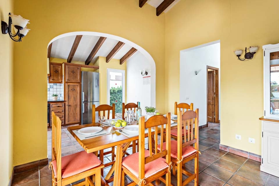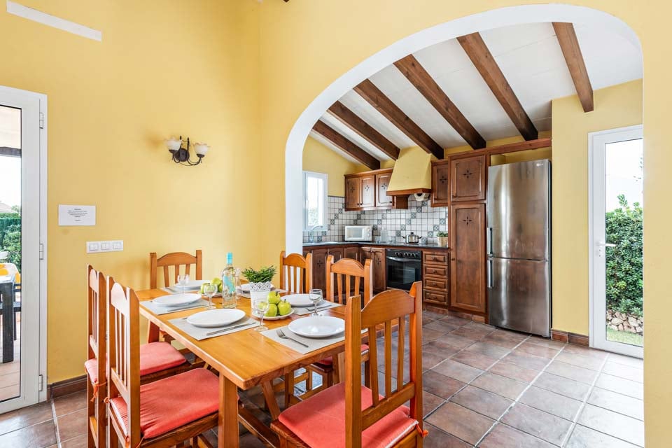 Charmerende på alle måder, Villa Jomar Bosch er bygget i den traditionelle menorcanske stil, som harmonerer med øens arkitektur. Interiøret gentager den afslappede middelhavsstemning med et elegant design og enkelt farveskema, der er parret med smukke fliser og synlige bjælker. Boligarealet emmer af plads og er opført i åben planløsning med store terrassedøre, der lader sollyset strømme ind, som oplyser hele villaen. Køkkenet har en autentisk spansk fornemmelse, med et hyggeligt spisebord, der skaber en naturlig opdeling i opholdsrummet.