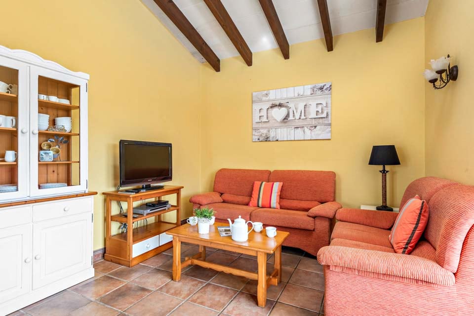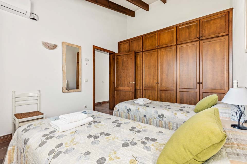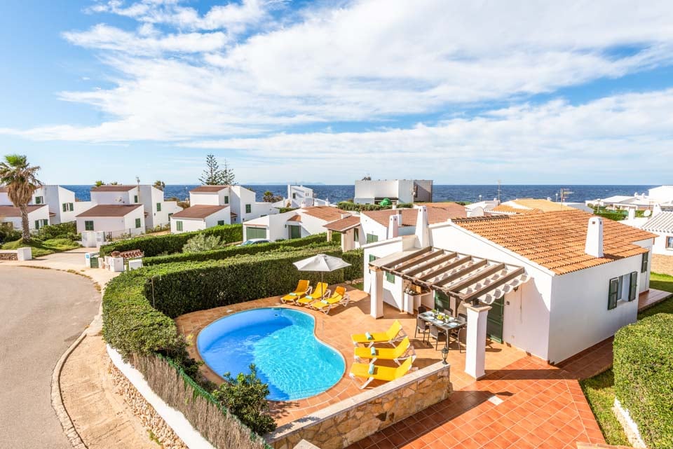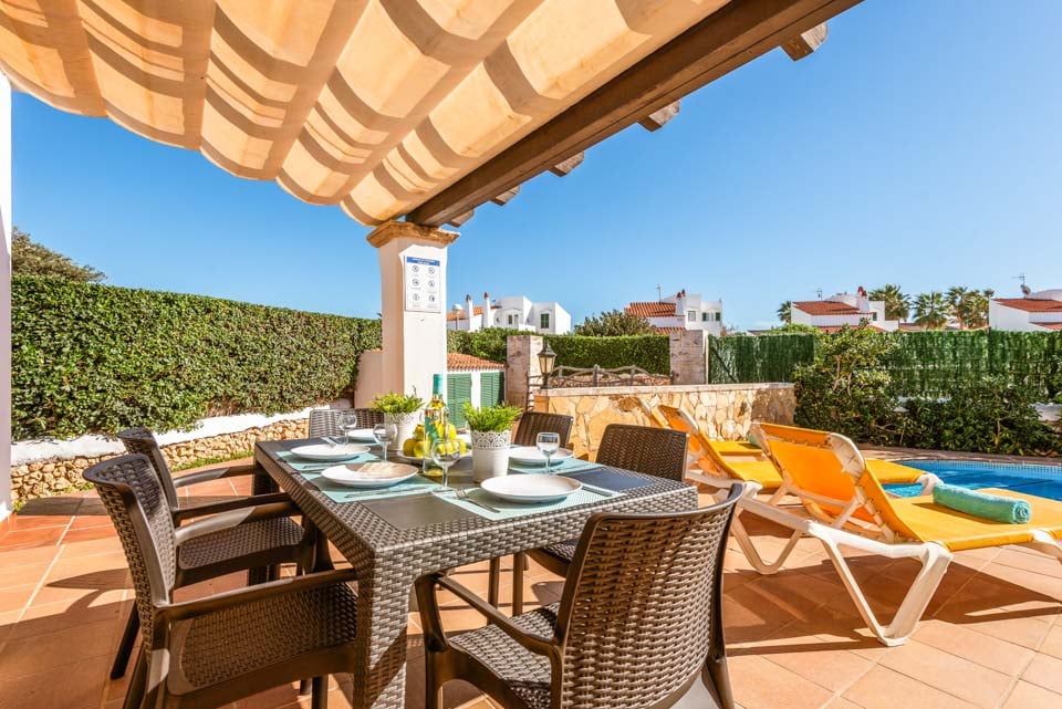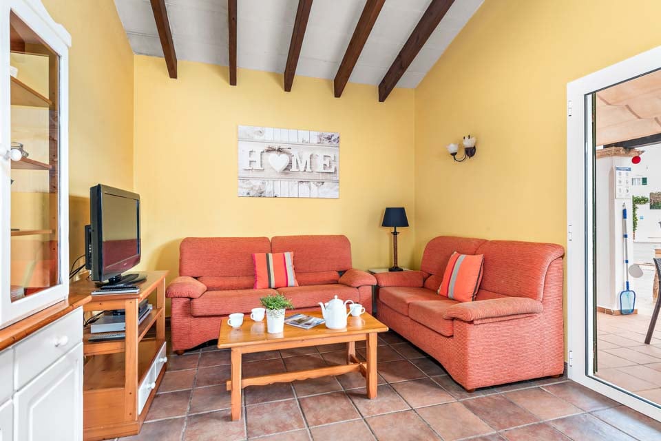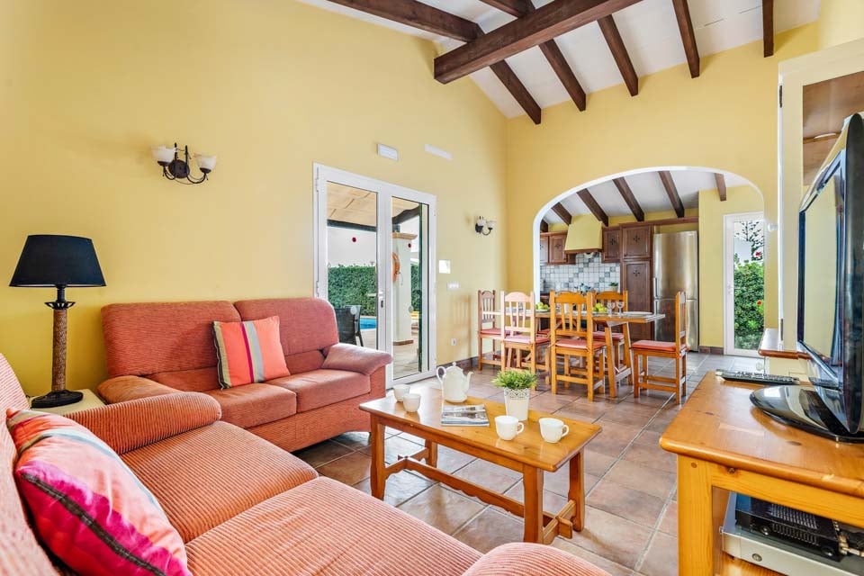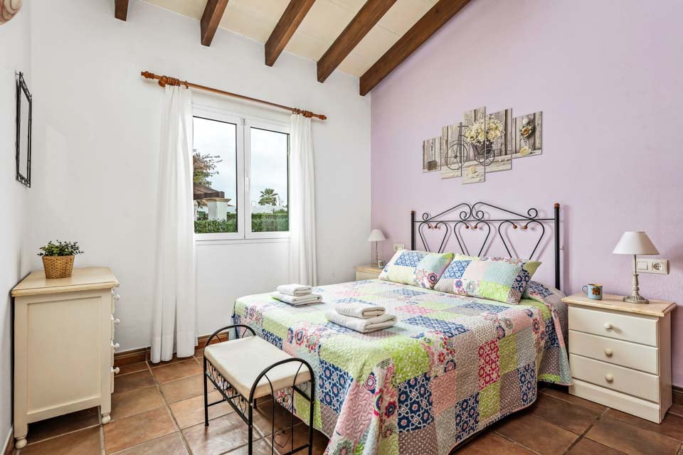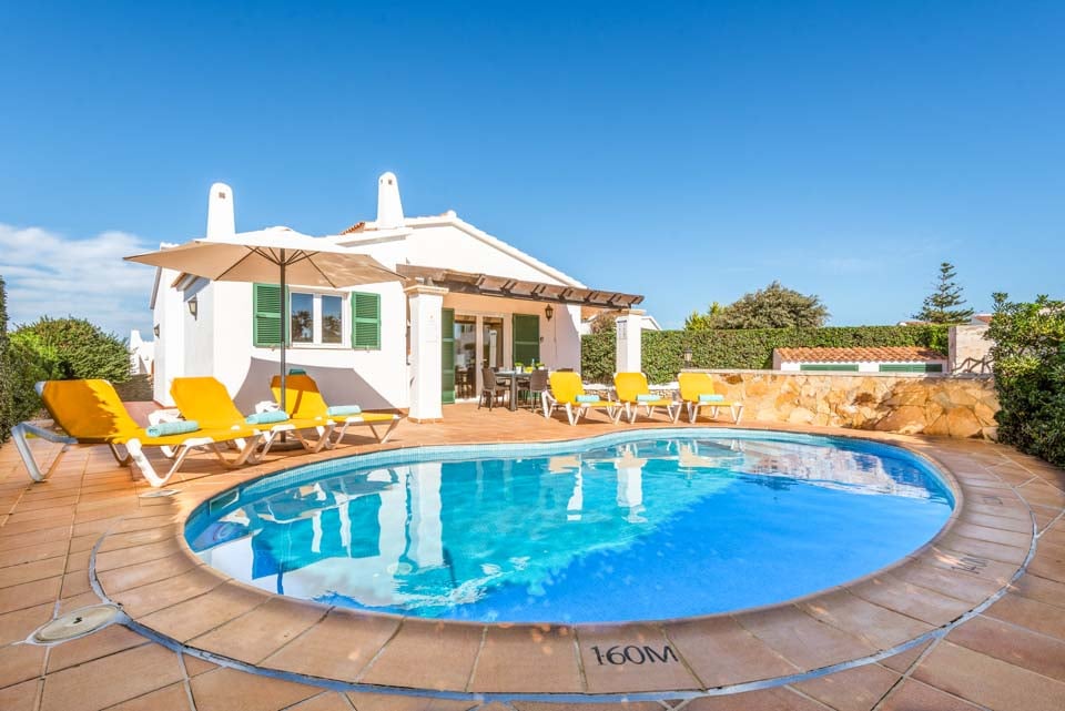 Charmerende på alle måder, Villa Jomar Bosch er bygget i den traditionelle menorcanske stil, som harmonerer med øens arkitektur. Interiøret gentager den afslappede middelhavsstemning med et elegant design og enkelt farveskema, der er parret med smukke fliser og synlige bjælker. Boligarealet emmer af plads og er opført i åben planløsning med store terrassedøre, der lader sollyset strømme ind, som oplyser hele villaen. Køkkenet har en autentisk spansk fornemmelse, med et hyggeligt spisebord, der skaber en naturlig opdeling i opholdsrummet.