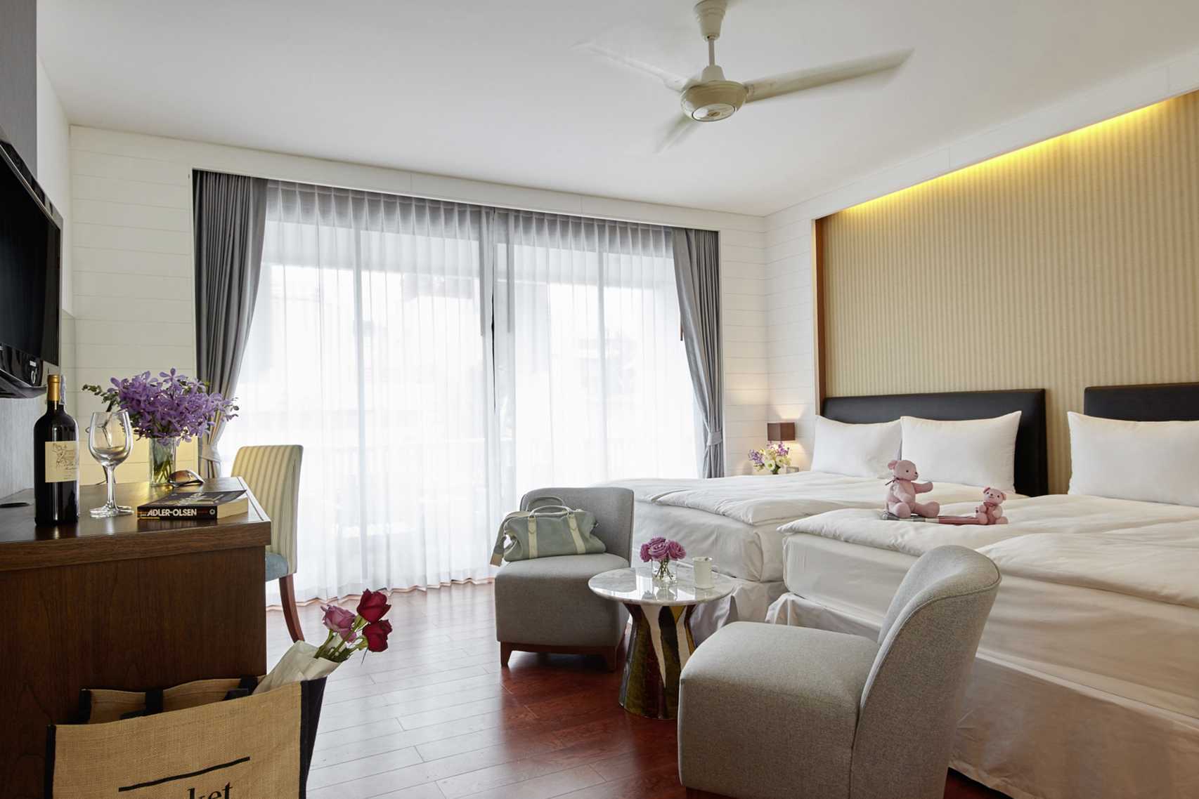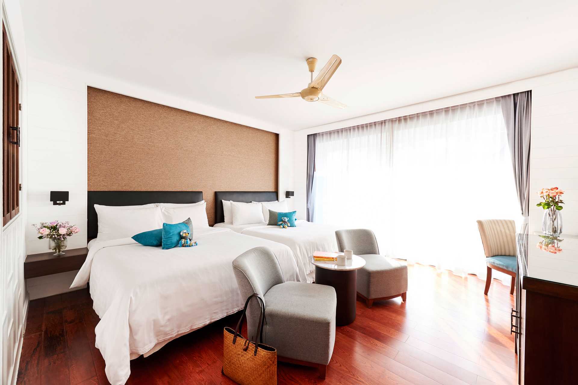 Deluxe-værelser med balkon i stueplan. En dobbeltseng eller to enkeltsenge. Mulighed for en ekstra opredning i sovesofa. Fjerde og femte person sover i eksisterende senge. Gratis wifi, aircondition og deponering. Minibar inkluderet med ikke-alkoholdige drikkevarer. El-kedel og kaffe/te. Tv med internationale kanaler. Hårtørrer. Badeværelse med bruser og toilet. Rengøring 7 gange om ugen.