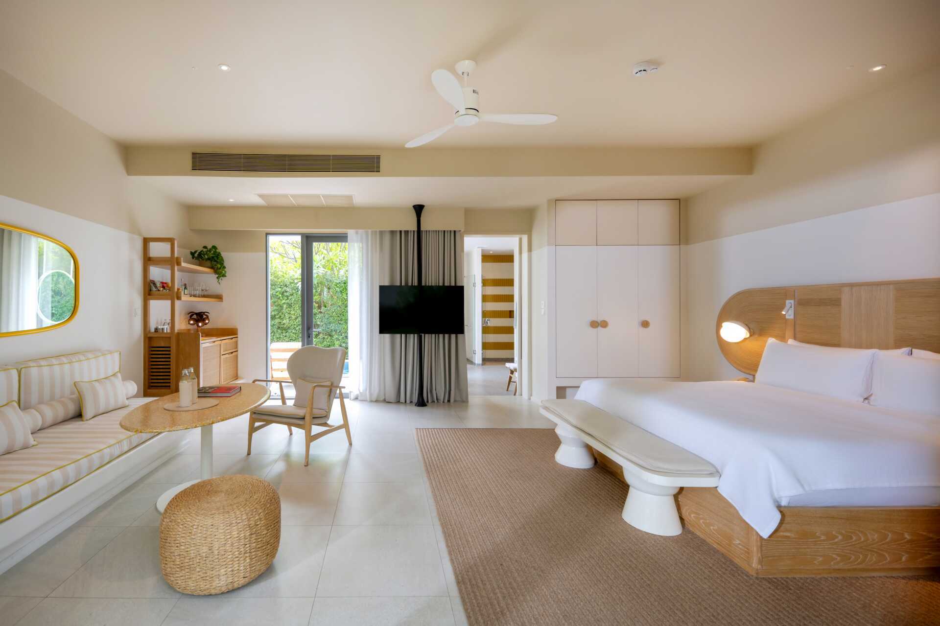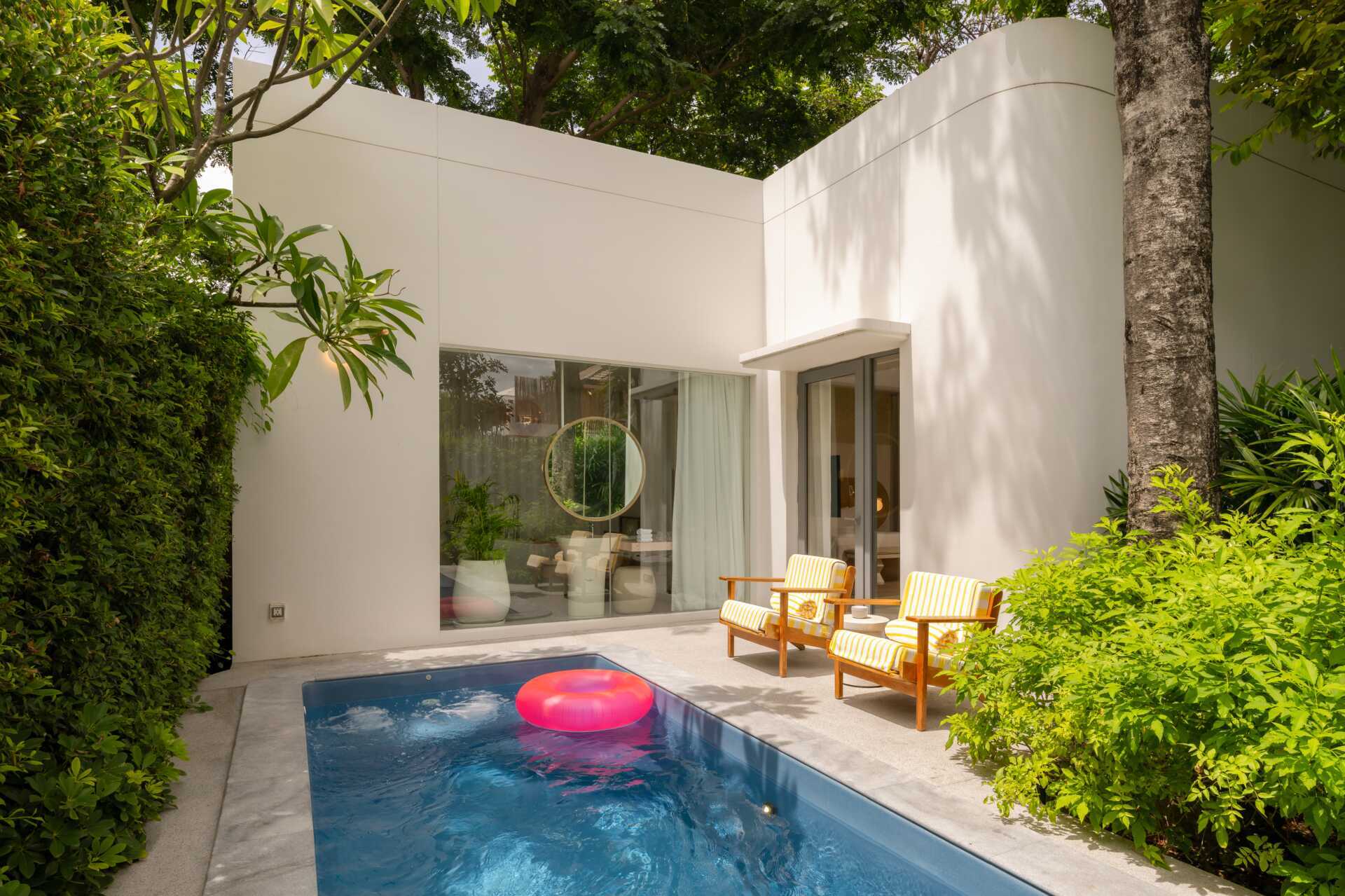 Dobbeltværelse i bungalow med udendørs plads, have med solterrasse og privat pool. Ved poolen er der to solstole med puder og poolhåndklæder. En dobbeltseng. Mulighed for ekstra opredning i daybed/enkeltseng. Gratis wifi, aircondition og deponering. Køleskab. Tv med internationale kanaler. Bluetooth højttaler. Badekåber og tøfler. Hårtørrer. Badeværelse med badekar, separat bruser og separat toilet. Rengøring 7 gange om ugen.