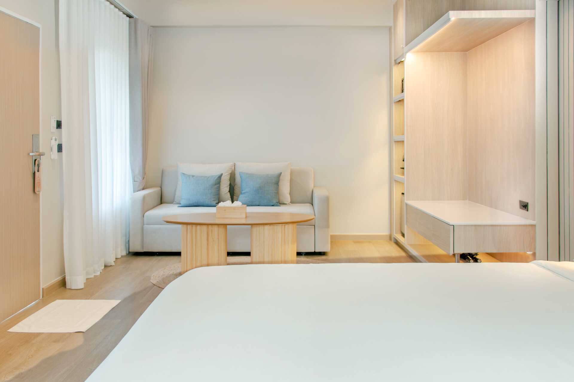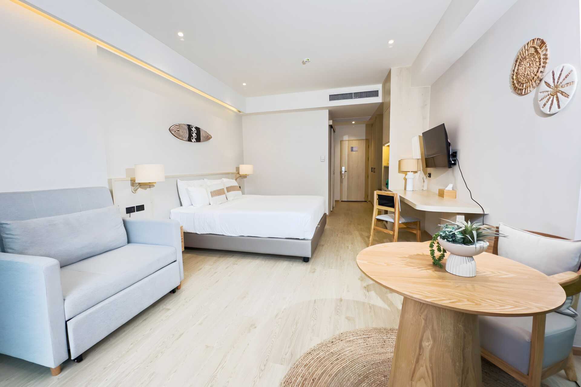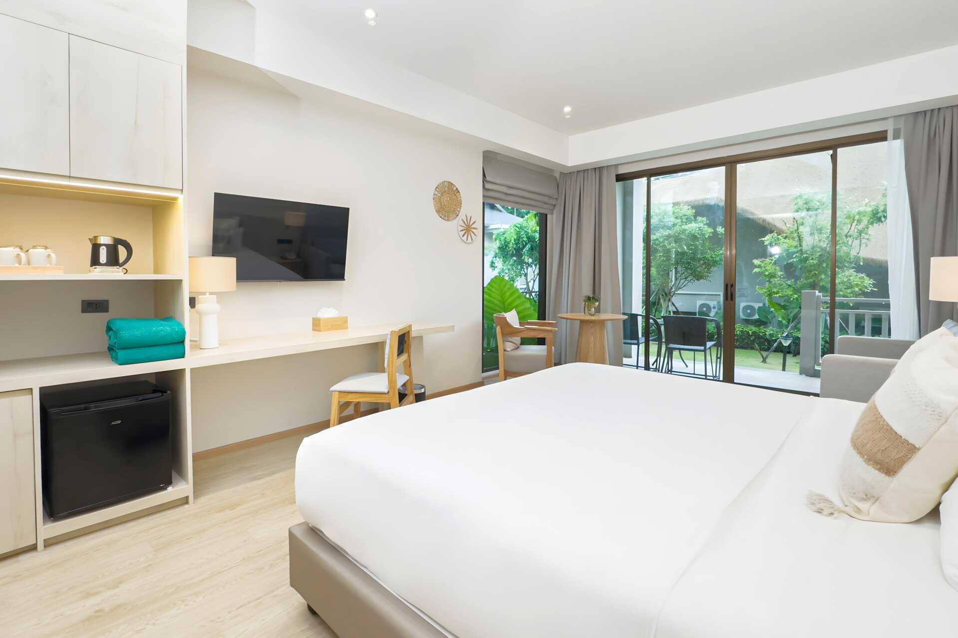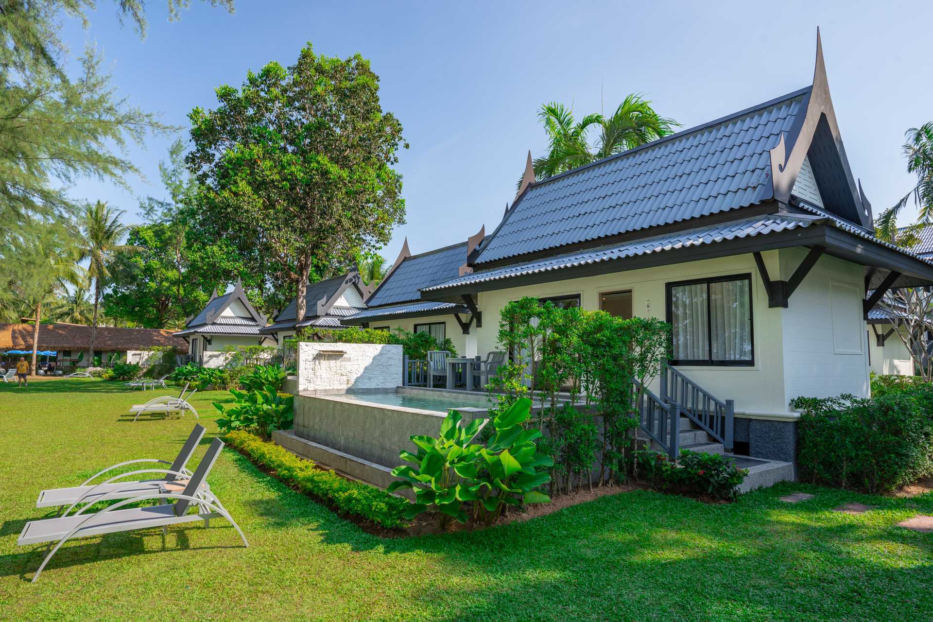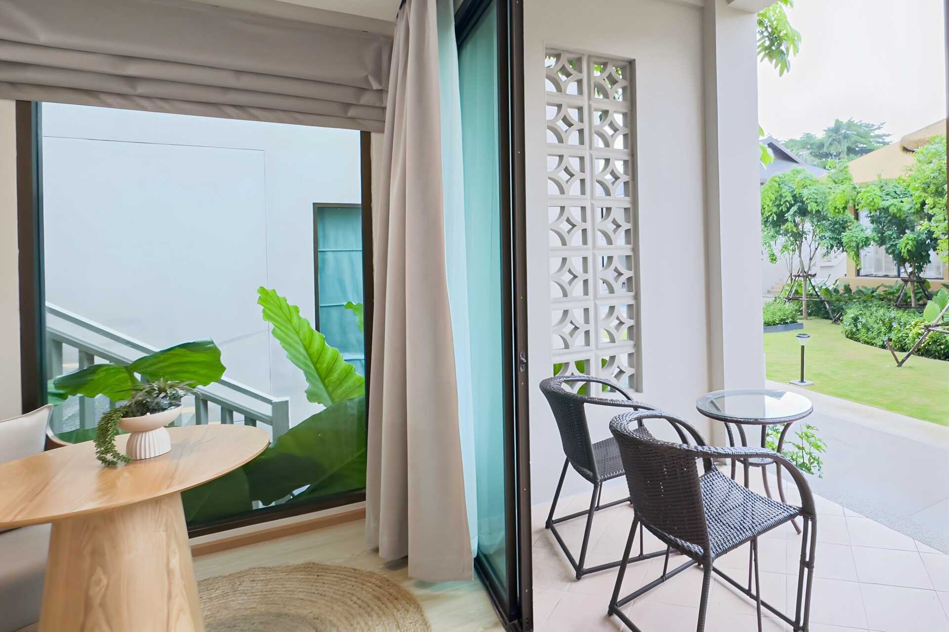 1-værelses lejlighed med terrasse i stueplan med bord og stole. Villaerne ligger i hotellets frodige have. En dobbeltseng eller to enkeltsenge. Mulighed for ekstra opredning i sovesofa. Gratis wifi, aircondition og deponering. Køleskab. El-kedel og kaffe/te. Tv med internationale kanaler. Hårtørrer. Badekåber og tøfler. Badeværelse med badekar, separat udendørs bruser og toilet. Rengøring 7 gange om ugen. Børn under to år tæller med i det maksimale antal personer på værelset.