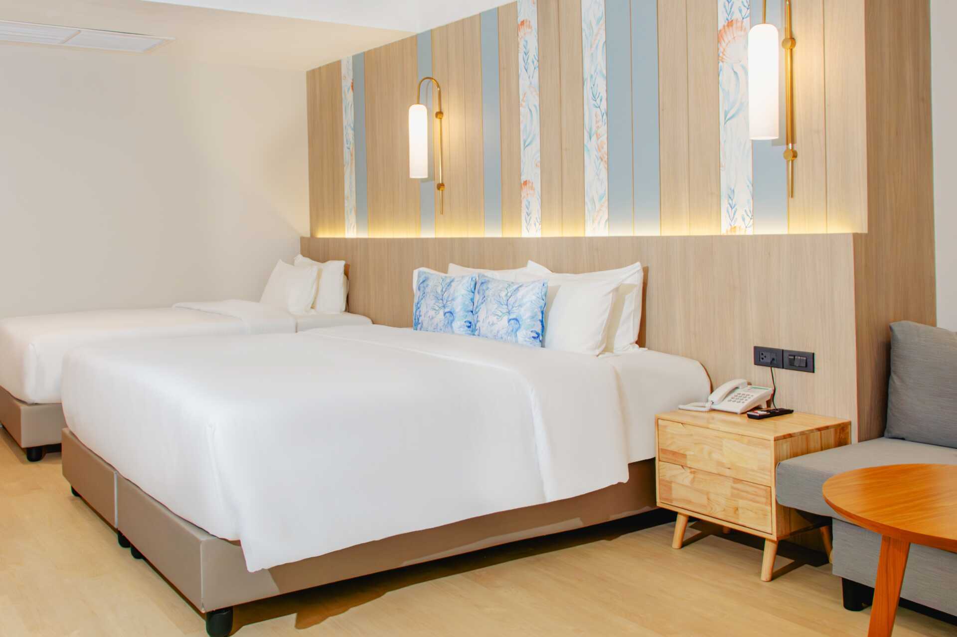 Familie-værelse med balkon. En dobbeltseng eller to enkeltsenge. Mulighed for ekstra opredning i enkeltseng eller i sovesofa. Den fjerde person sover i eksisterende senge eller på sovesofa. Gratis wifi, aircondition og deponering. Køleskab. El-kedel og kaffe/te. Tv med internationale kanaler. Hårtørrer. Badekåber og tøfler. Badeværelse med badekar og toilet. Rengøring 7 gange om ugen. Børn under to år tæller med i det maksimale antal personer på værelset.