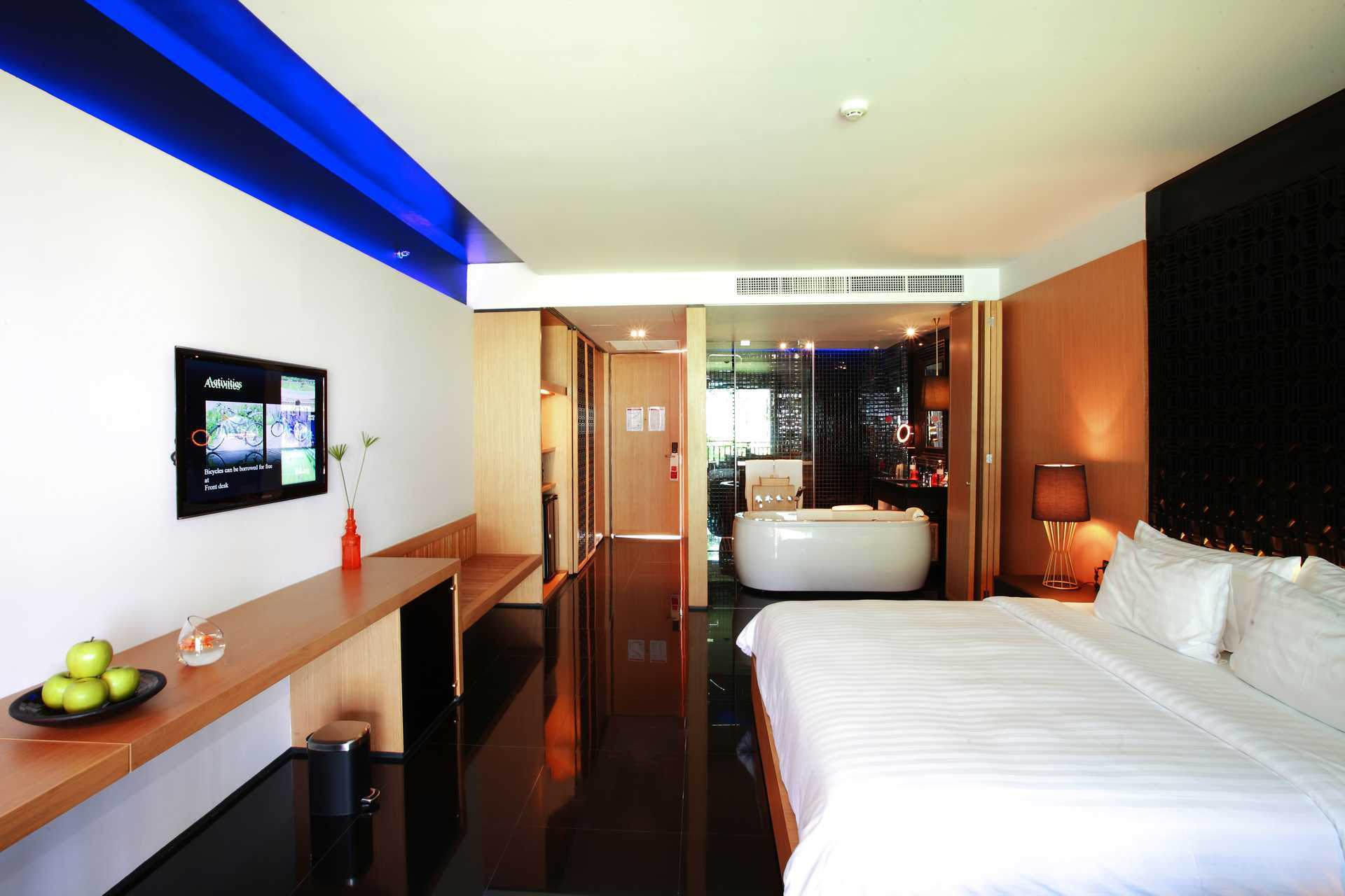 Dobbeltværelser med jacuzzi på værelset. Dobbeltseng. 3. og 4. person mulig hvis de er børn og deler ordinære senge. Ekstra opredning for voksne i sovesofa. Gratis wifi, aircondition og deponering. Minibar. El-kedel samt kaffe/te. Tv med internationale kanaler. Badekåber og tøfler. Hårtørrer. Badeværelse med badekar, separat bruser samt toilet. Balkon.