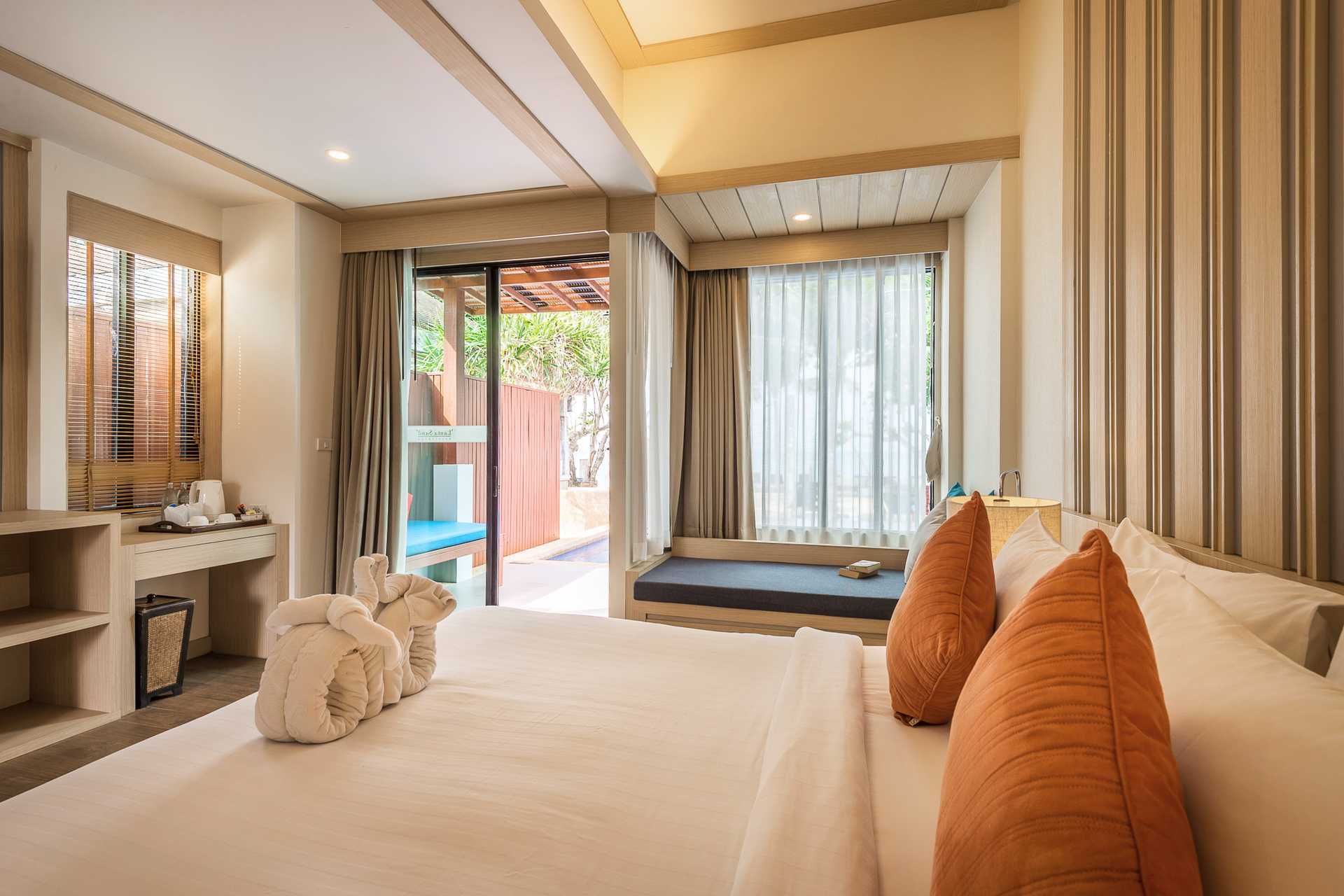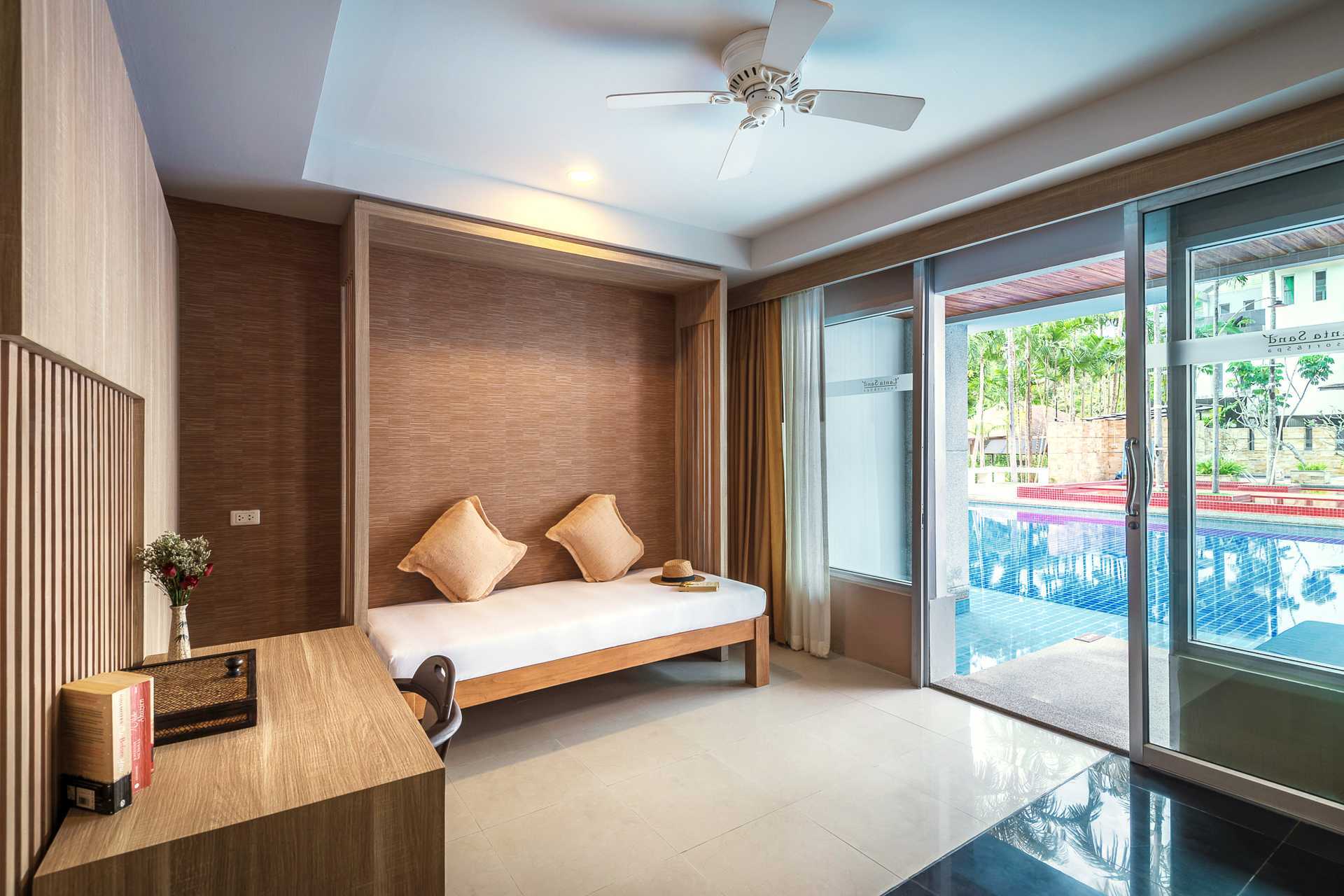 Bungalow med direkte adgang til Delt pool. Værelserne ligger tæt på stranden og med direkte adgang til en pool, som deles af otte bungalows. En dobbeltseng. Mulighed for ekstra seng i konvertibel daybed. Gratis wifi, aircondition og deponering. Køleskab. El-kedel og kaffe/te. Tv med internationale kanaler. Hårtørrer. Badeværelse med bruser og toilet. Rengøring 7 gange om ugen.