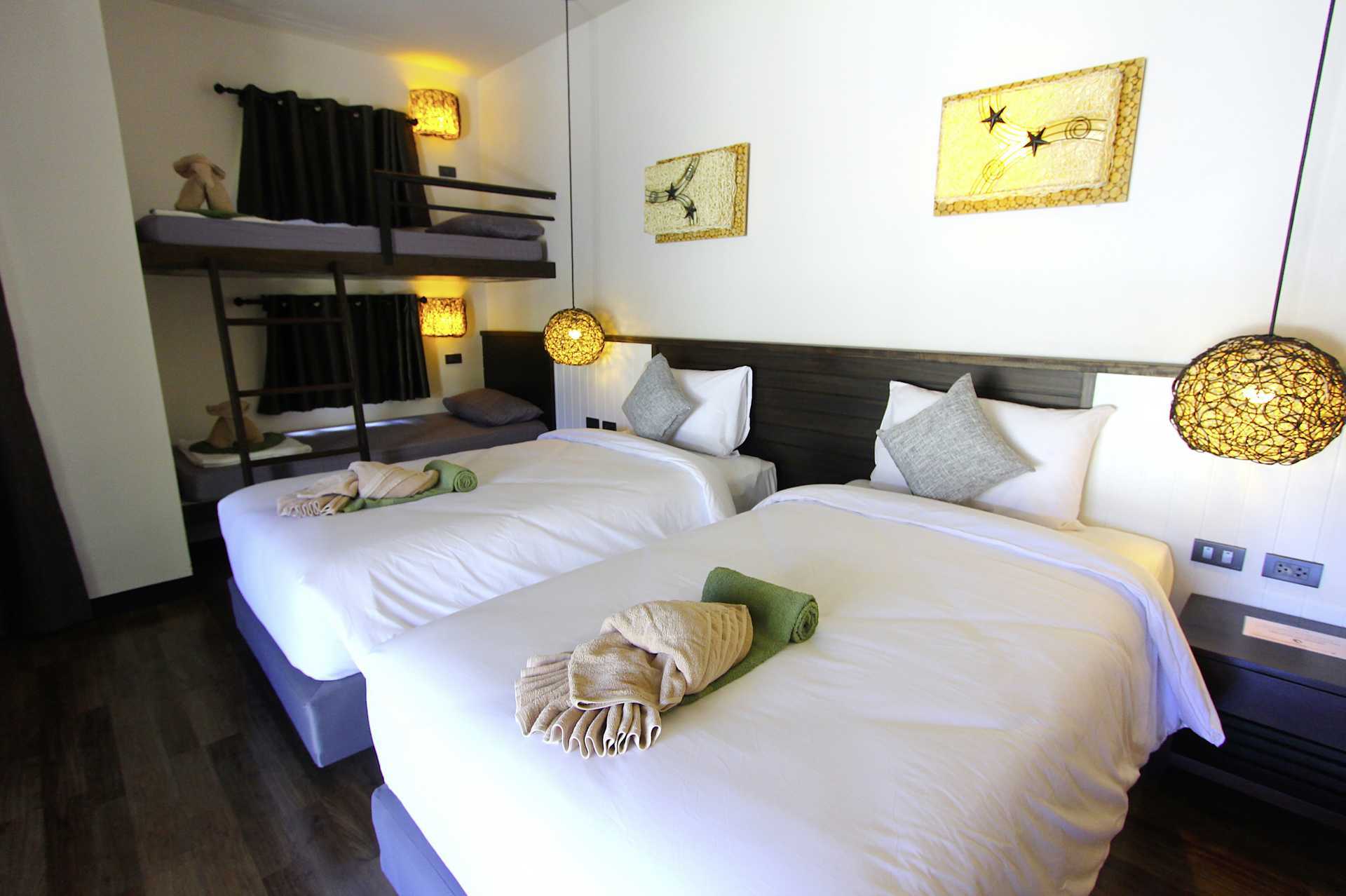 Familie-værelser i bungalows med terrasse i stueplan af varierende størrelse. En dobbeltseng eller to enkeltsenge. Mulighed for ekstra opredning i køjesenge til to børn. Gratis wifi, aircondition og deponering. Køleskab. El-kedel og kaffe/te. Tv med internationale kanaler. Hårtørrer. Badeværelse med bruser og toilet. Rengøring 7 gange om ugen.