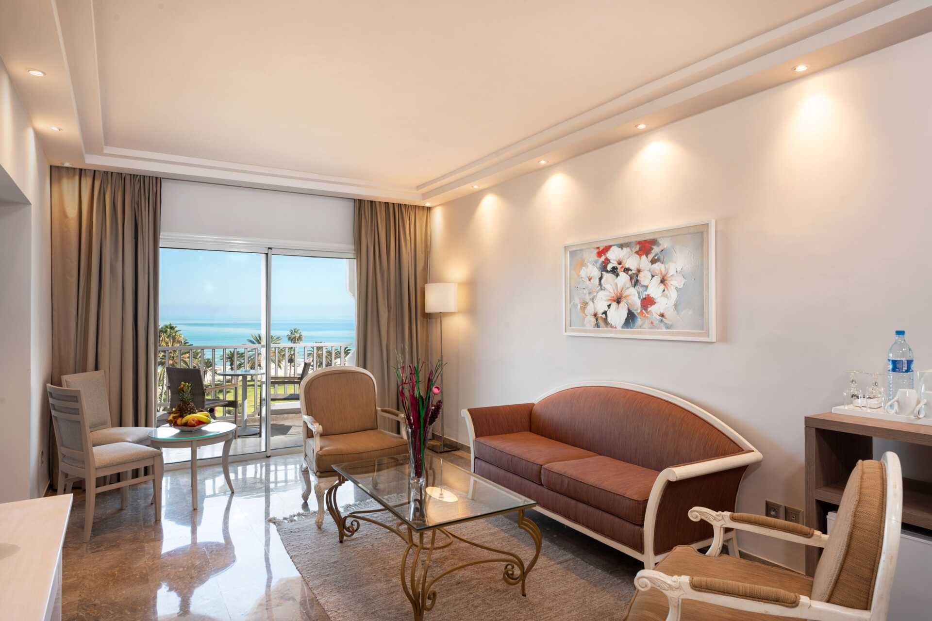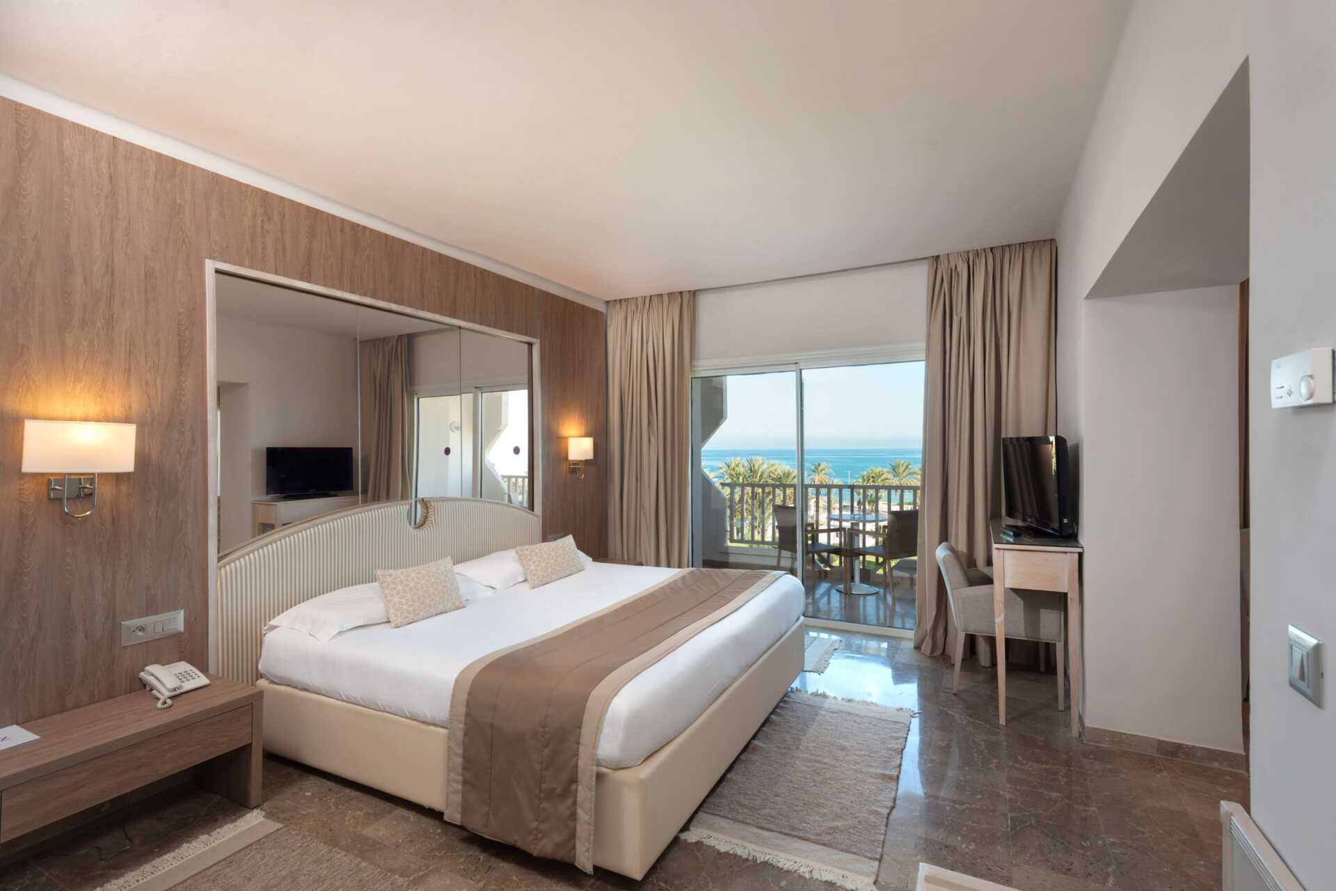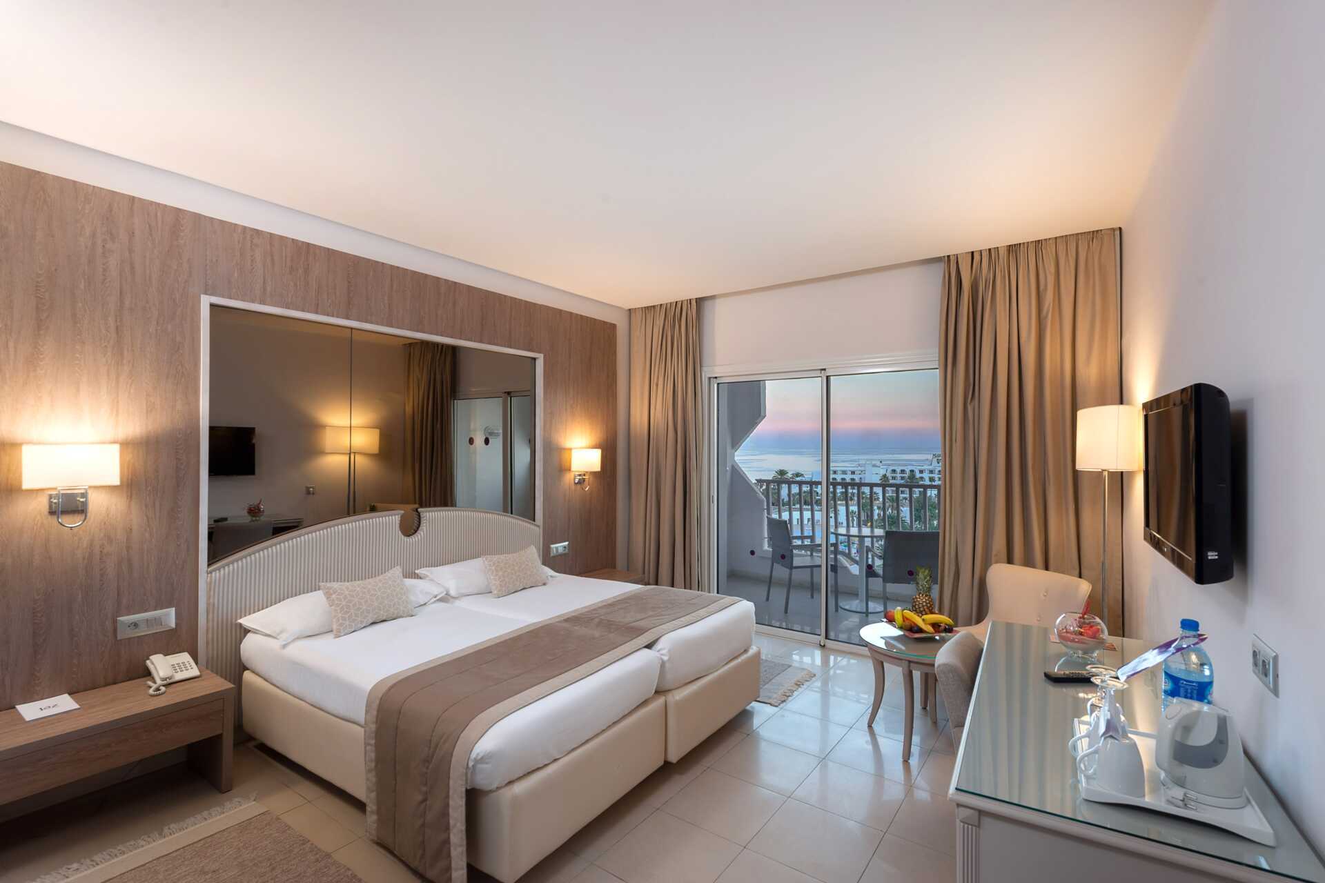 Deluxe-værelser med balkon og havudsigt. Deluxe-værelset består af et soveværelse og et opholdsrum med sofa, bord og stole. En dobbeltseng. Mulighed for ekstra opredning i fold ud-seng. Gratis wifi, aircondition og deponering. Minibar mod betaling, en flaske vand er inkluderet og genopfyldes hver dag. Tv med internationale kanaler. Hårtørrer. Badeværelse med bruser og toilet. Rengøring 7 gange om ugen.