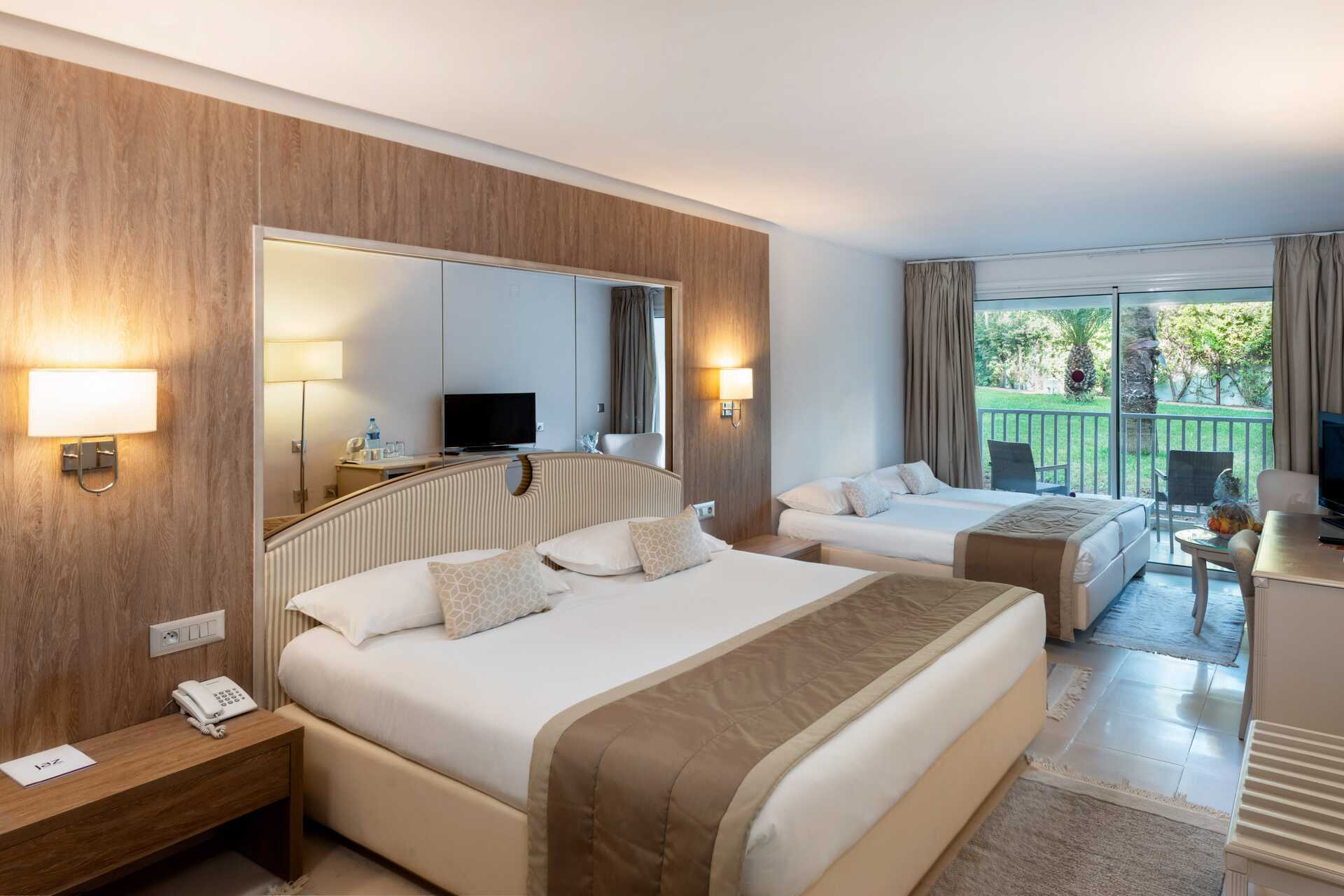 Familie-værelser med terrasse i stueplan. En dobbeltseng. Mulighed for ekstra opredninger i sovesofa. Gratis wifi, aircondition og deponering. Minibar mod betaling, en flaske vand er indgår og genopfyldes hver dag. El-kedel og kaffe/te. Tv med internationale kanaler. Hårtørrer. Badeværelse med badekar og bruser samt toilet. Rengøring 7 gange om ugen.