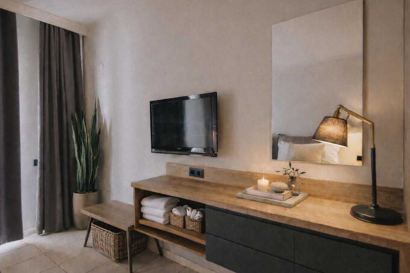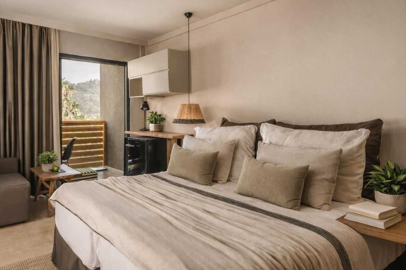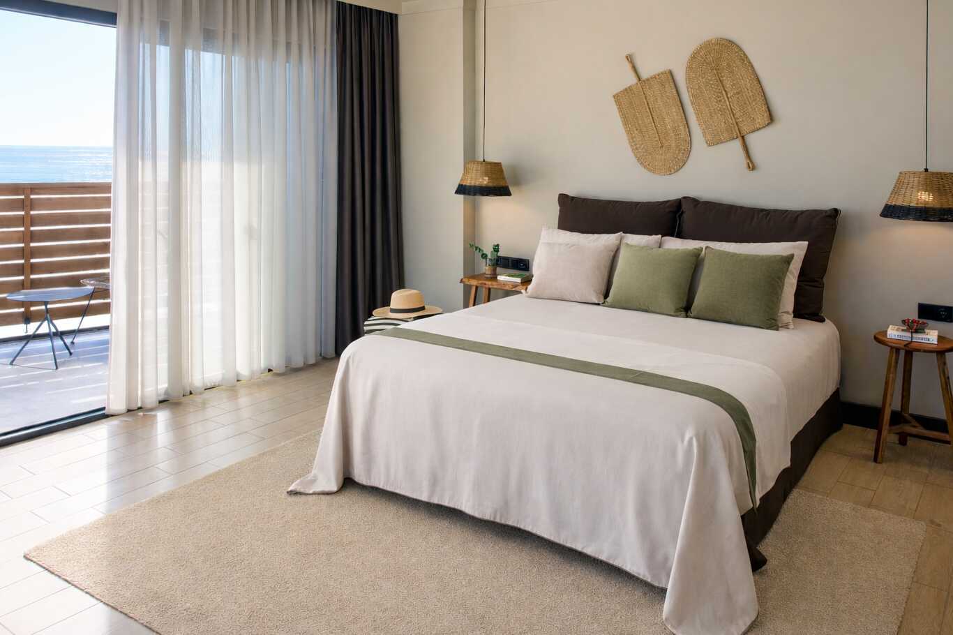 Større dobbeltværelser med balkon eller terrasse, nogle med havudsigt eller delvis havudsigt. En dobbeltseng eller to enkeltsenge. Gratis wifi, aircondition og deponering. Køleskab. Tv med internationale kanaler. Hårtørrer. Badeværelse med bruser og toilet. Rengøring 7 gange om ugen.