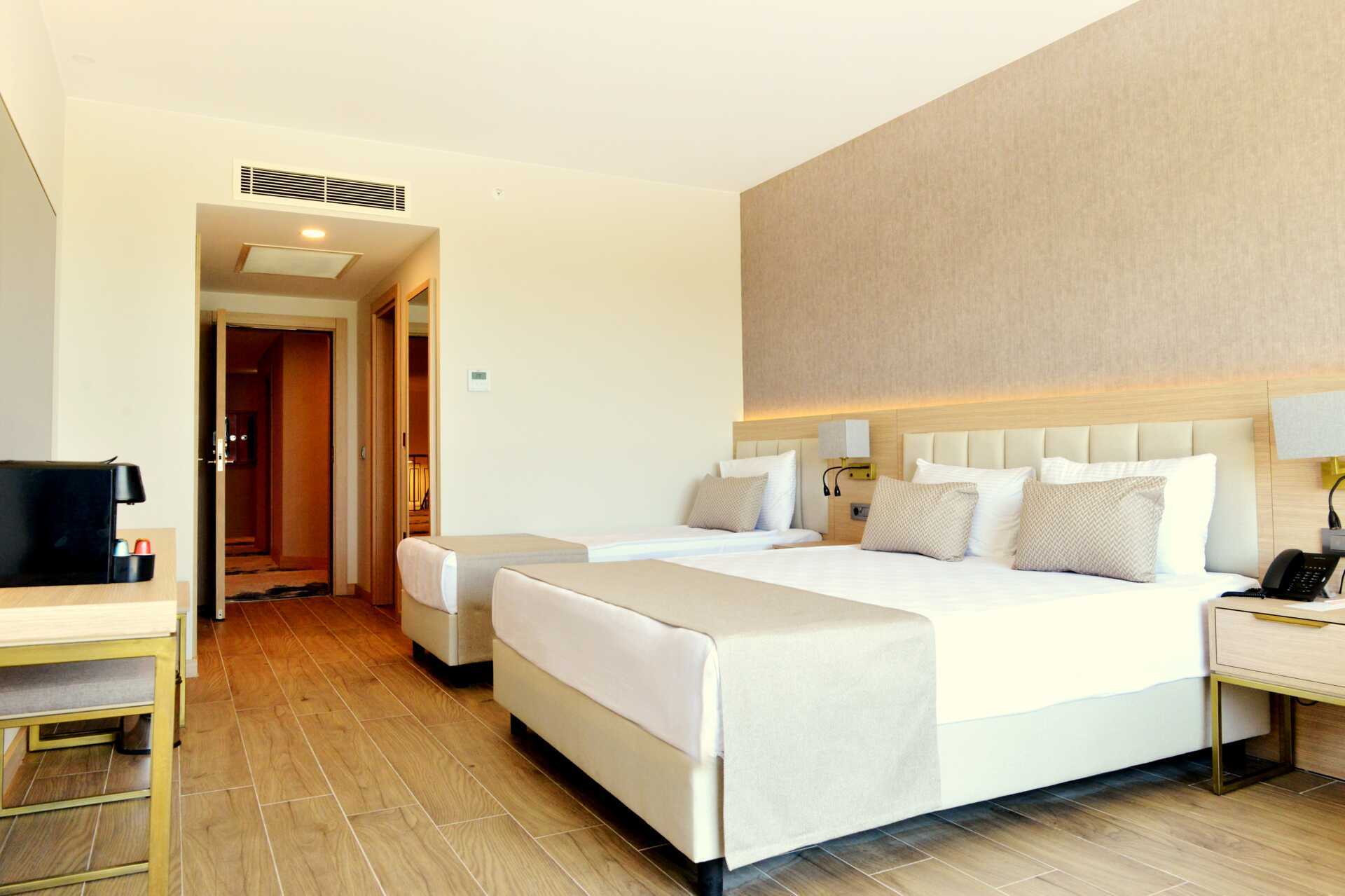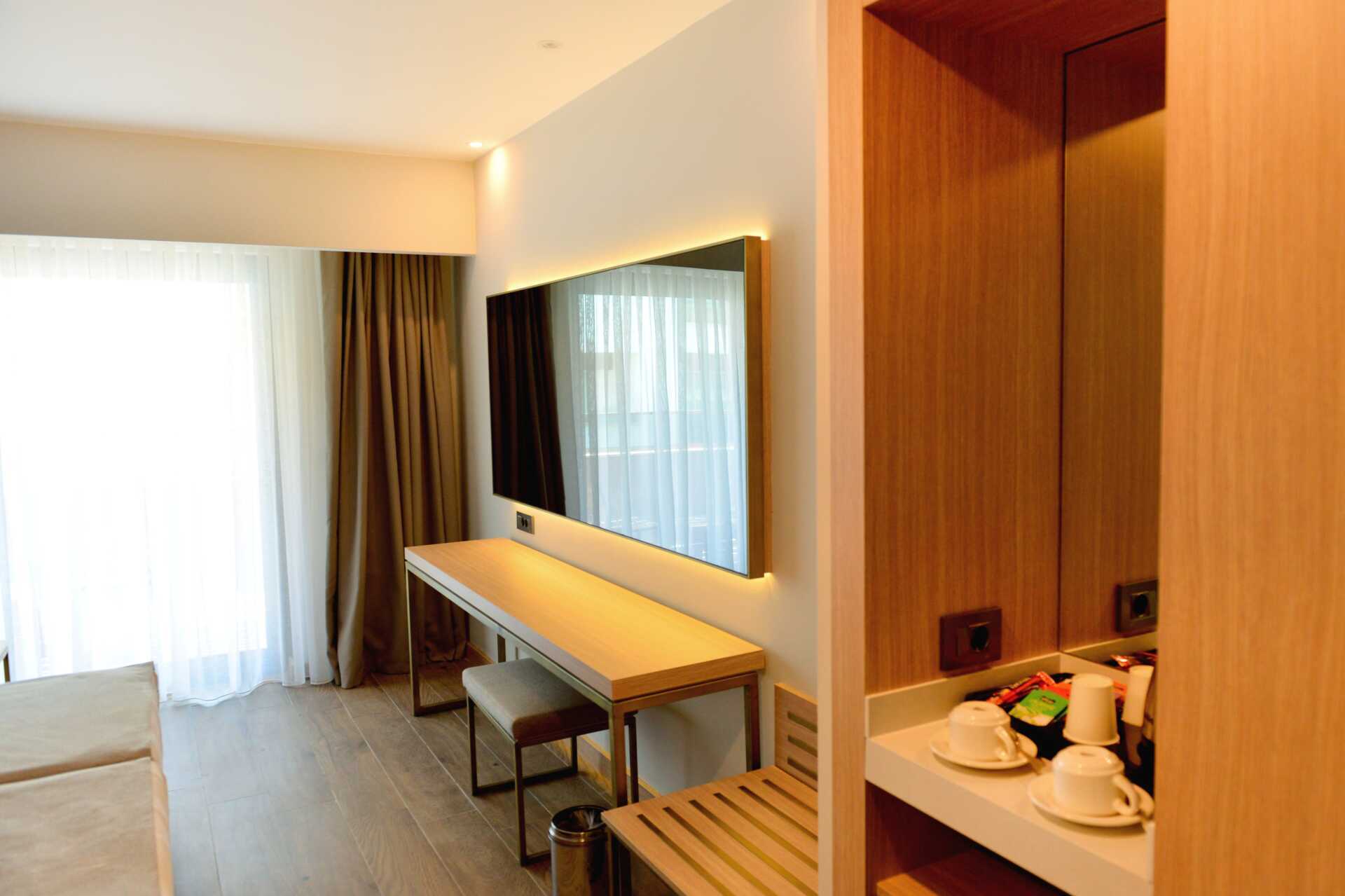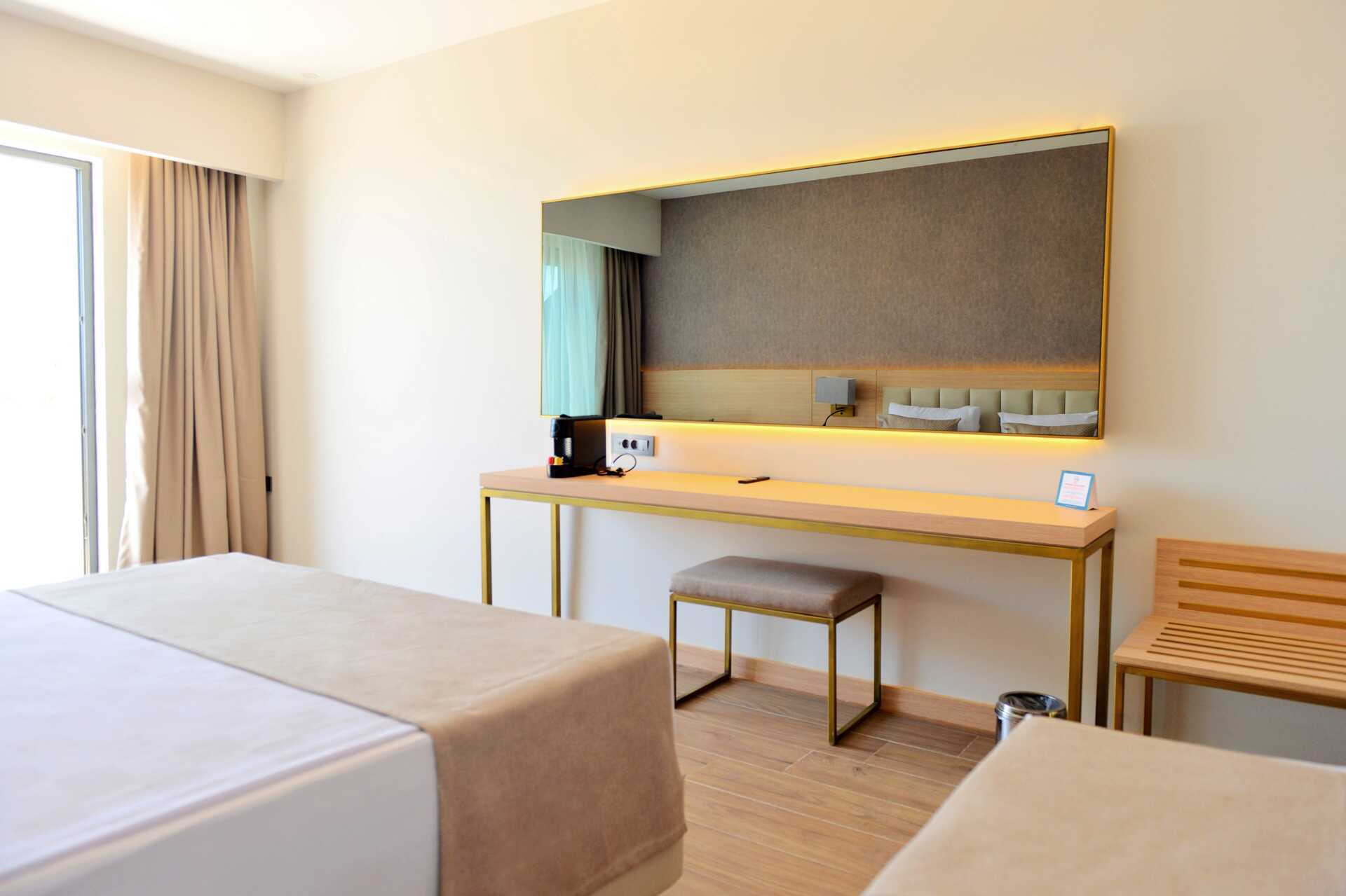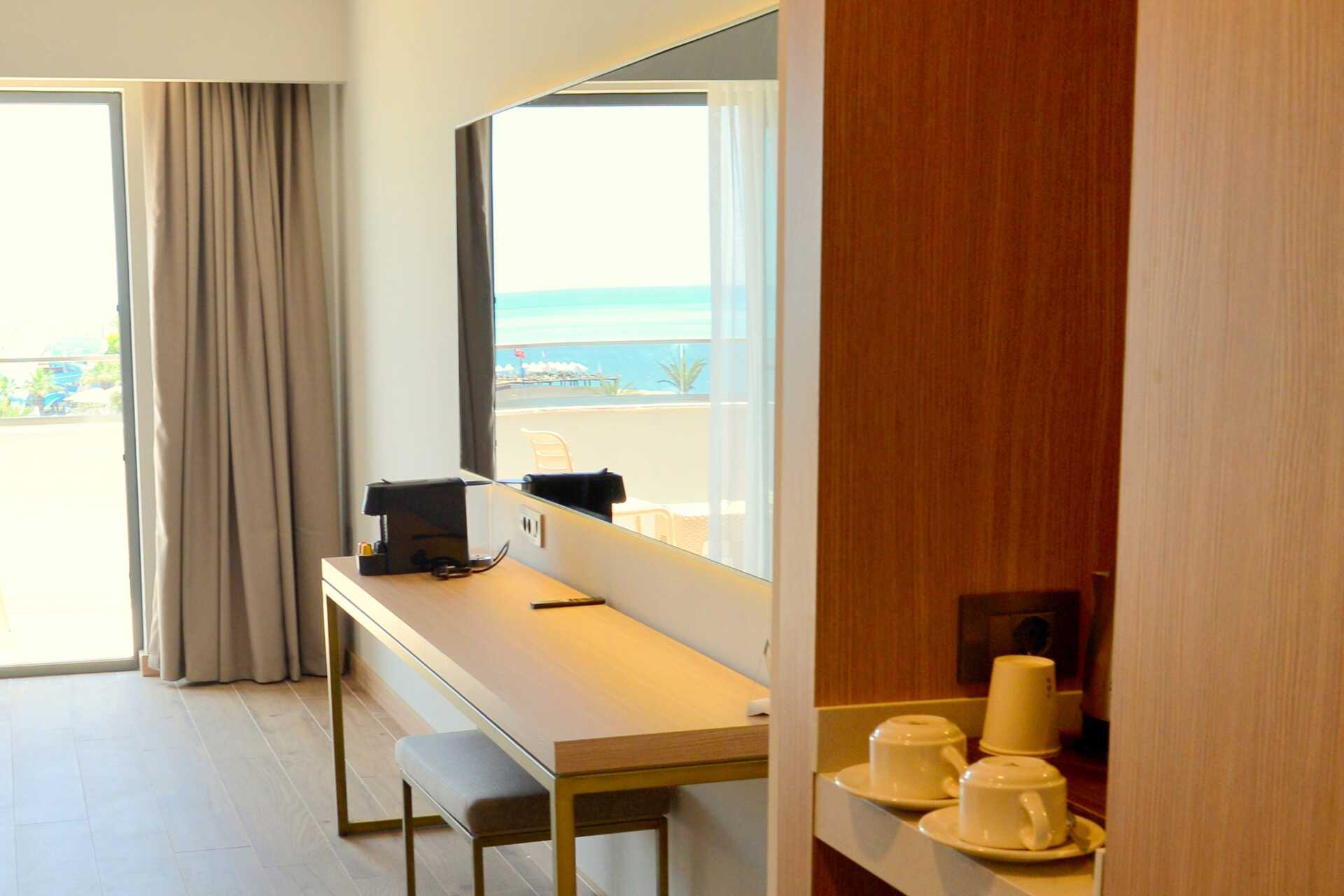 Deluxe-værelse med balkon og havudsigt. En dobbeltseng eller to enkeltsenge. Mulighed for ekstra opredning i enkeltseng. Gratis wifi, aircondition og deponering. Minibar (fyldes dagligt). Kapselmaskine til kaffe. El-kedel og kaffe/te. Tv med internationale kanaler. Badekåber og tøfler. Hårtørrer. Badeværelse med bruser og toilet. Rengøring 7 gange om ugen. Børn under to år tæller med i det maksimale antal personer på værelset.