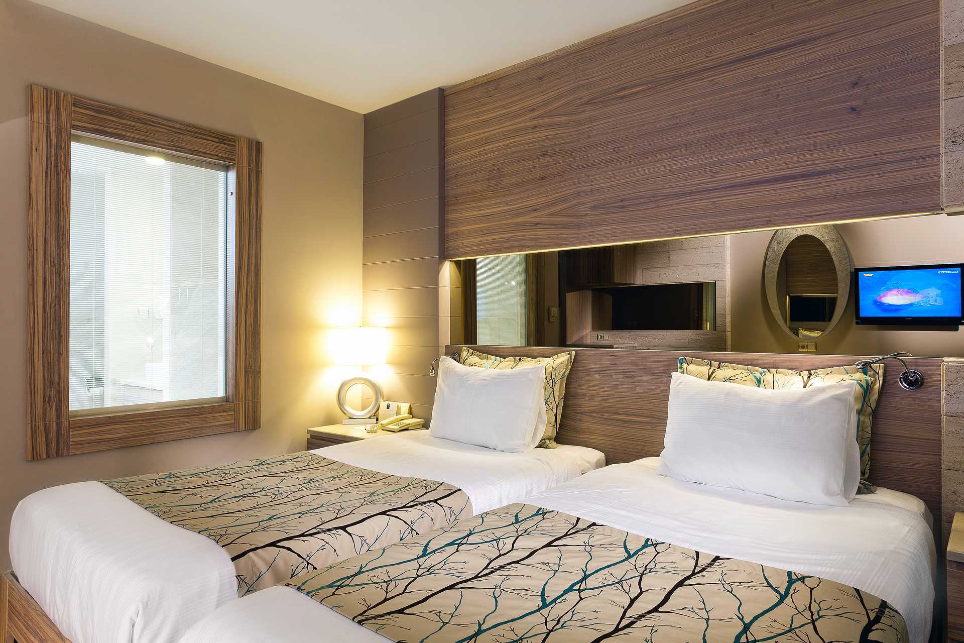 Dobbeltværelser med balkon, nogle med havudsigt og nogle med delvis havudsigt. To enkeltsenge. Mulighed for ekstra opredninger i sovesofa. Gratis wifi og centralt styret aircondition (tændes/slukkes på forskellige tidspunkter afhængigt af vejret) og deponering. Minibar. El-kedel og kaffe/te. Tv med internationale kanaler. Tøfler. Hårtørrer. Badeværelse med bruser og toilet. Rengøring 7 gange om ugen. Børn under to år tæller med i det maksimale antal personer på værelset.