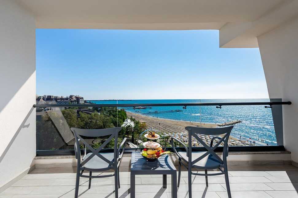 Større familie-værelse med balkon og delvis havudsigt. To soveværelser med en dobbeltseng eller to enkeltsenge i hvert soveværelse. Gratis wifi, aircondition og deponering. Minibar. El-kedel og kaffe/te. Tv med internationale kanaler. Badekåber og tøfler. Hårtørrer. To badeværelser med bruser og toilet. Rengøring 7 gange om ugen.