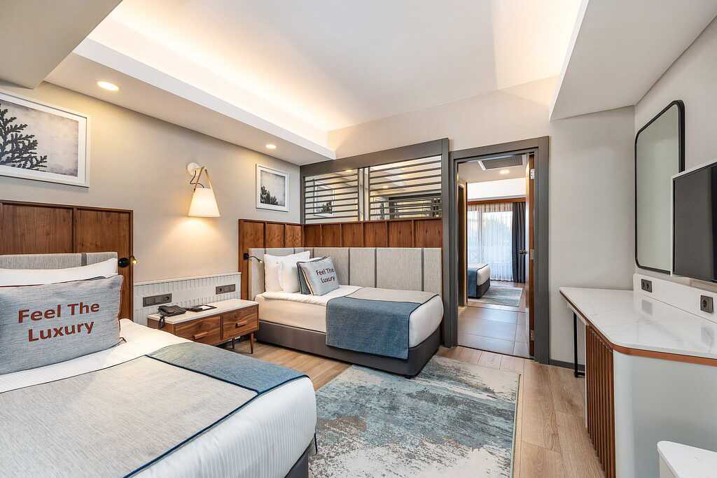 Familie-værelse med balkon og delvis havudsigt. To soveværelser med en dobbeltseng eller to enkeltsenge i hvert soveværelse. Gratis wifi, aircondition og deponering. Minibar. El-kedel og kaffe/te. Tv med internationale kanaler. Badekåber og tøfler. Hårtørrer. Badeværelse med bruser og toilet. Rengøring 7 gange om ugen.