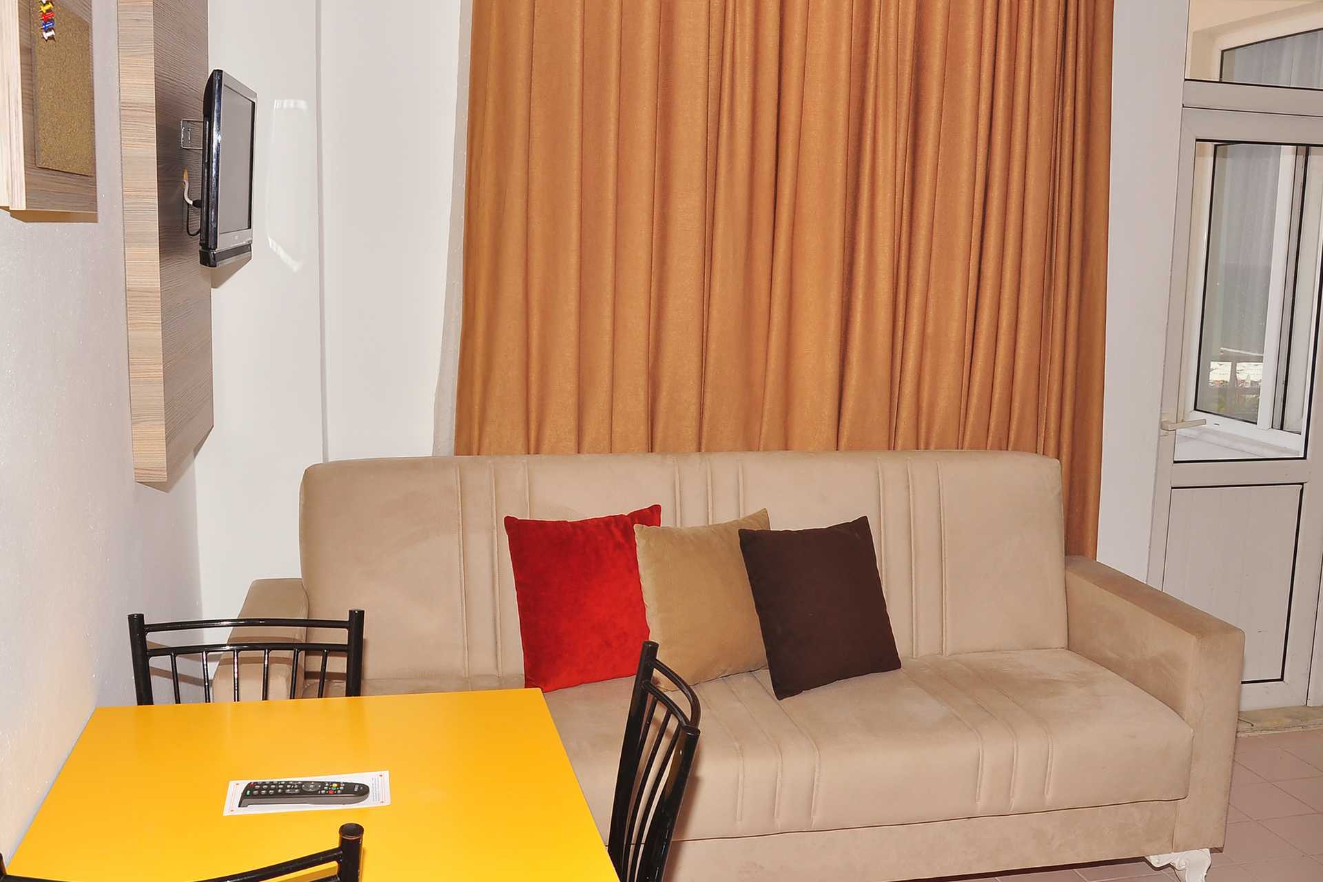 2-værelses lejlighed med balkon. Soveværelse og kombineret opholdsrum med minikøkken. En dobbeltseng eller to enkeltsenge. Mulighed for ekstra opredning i to lænestole. Minikøkken med kogeplader, køleskab og enkelt køkkenudstyr. Aircondition mod betaling. I nogle lejligheder er der aircondition i soveværelset, i andre kun i opholdsrummet. Hårtørrer. Badeværelse med bruser og toilet. Rengøring 7 gange om ugen.
