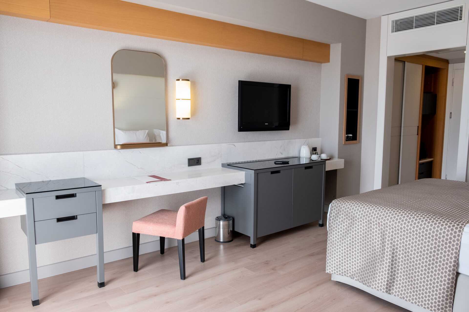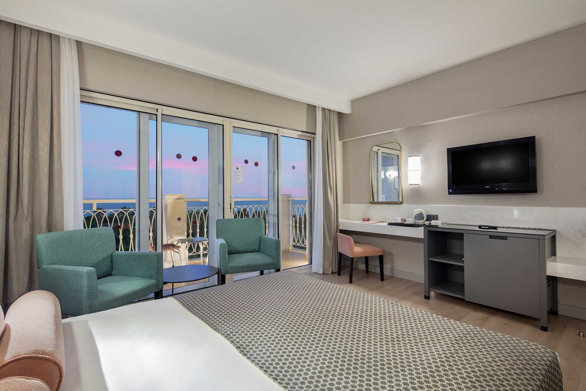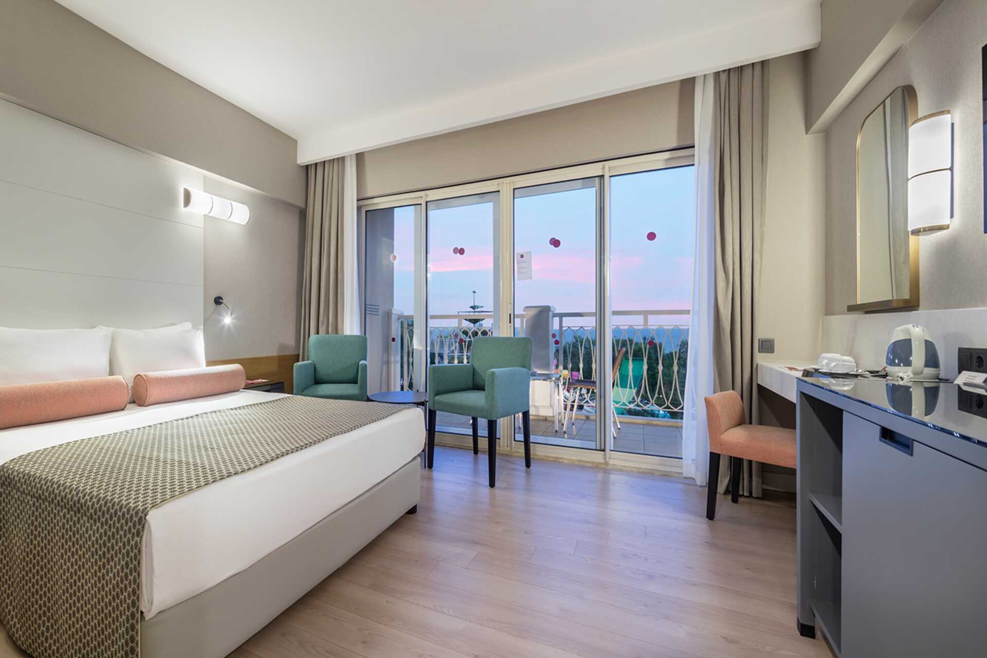Dobbeltværelser med balkon, nogle med havudsigt og nogle med delvis havudsigt. En dobbeltseng eller to enkeltsenge. Mulighed for ekstra opredning i sovesofa. Gratis wifi, aircondition og deponering. Minibaren inkluderer sodavand, øl og vand og genopfyldes dagligt. El-kedel og kaffe/te. Tv med internationale kanaler. Badekåber og tøfler. Hårtørrer. Badeværelse med bruser og toilet. Rengøring 7 gange om ugen.