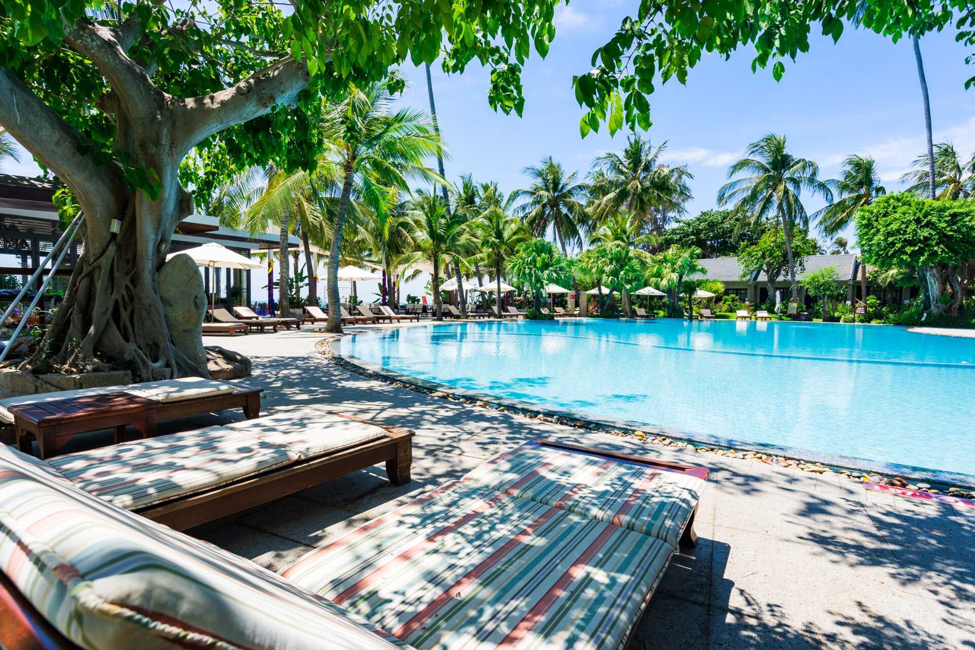 Det smukke poolområde er omfavnet af palmer med udsigt over det glitrende hav og strand. Poolen er opdelt i tre dele med forskellige vanddybder, hvoraf den ene del er mere lavvandet for børn. Solstole og parasoller gratis. Der er også solstole og parasoller til at låne på stranden, samt en snackbar, hvor man kan købe noget at spise og drikke.